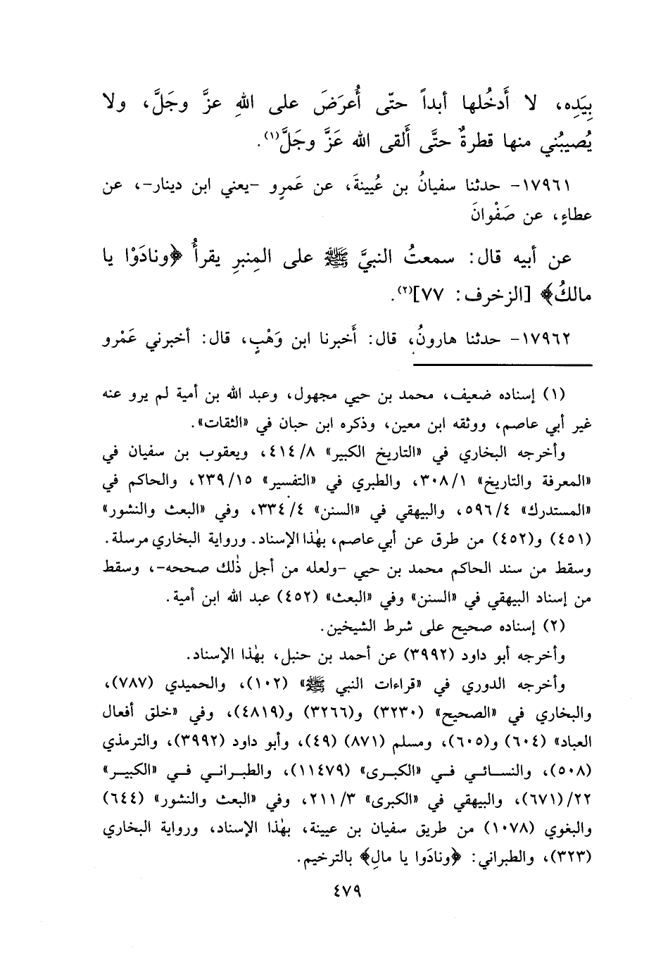١٧٩٦١ - حَدَّثَنَا سُفْيَانُ بْنُ عُيَيْنَةَ، عَنْ عَمْرٍو يَعْنِي ابْنَ دِينَارٍ، عَنْ عَطَاءٍ، عَنْ صَفْوَانَ، عَنْ أَبِيهِ، قَالَ: سَمِعْتُ النَّبِيَّ صَلَّى اللهُ عَلَيْهِ وَسَلَّمَ عَلَى الْمِنْبَرِ يَقْرَأُ {وَنَادَوْا يَا مَالِكُ} [الزخرف: ٧٧] " (٢)
