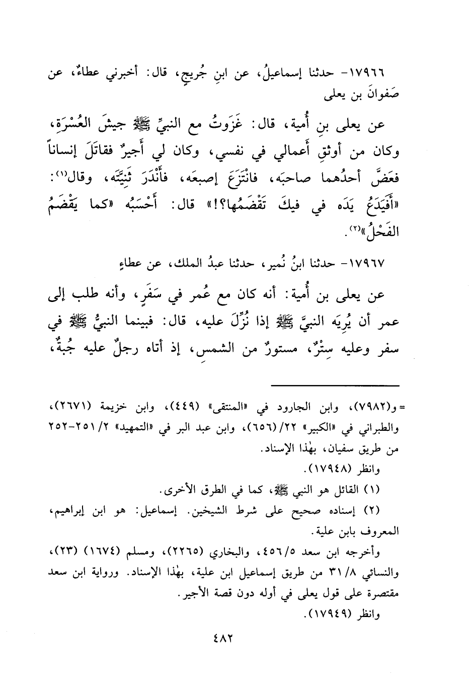 ١٧٩٦٦ - حَدَّثَنَا إِسْمَاعِيلُ، عَنِ ابْنِ جُرَيْجٍ، قَالَ: أَخْبَرَنِي عَطَاءٌ، عَنْ صَفْوَانَ بْنِ يَعْلَى، عَنْ يَعْلَى بْنِ أُمَيَّةَ، قَالَ: غَزَوْتُ مَعَ النَّبِيِّ صَلَّى اللهُ عَلَيْهِ وَسَلَّمَ جَيْشَ الْعُسْرَةِ، وَكَانَ مِنْ أَوْثَقِ أَعْمَالِي فِي نَفْسِي، وَكَانَ لِي أَجِيرٌ فَقَاتَلَ إِنْسَانًا فَعَضَّ أَحَدُهُمَا صَاحِبَهُ، فَانْتَزَعَ أُصْبُعَهُ، فَأَنْدَرَ ثَنِيَّتَهُ (١) ، وَقَالَ: " أَفَيَدَعُ يَدَهُ فِي فِيكَ تَقْضِمُهَا؟ " قَالَ: أَحْسَبُهُ " كَمَا يَقْضِمُ الْفَحْلُ " (٢)