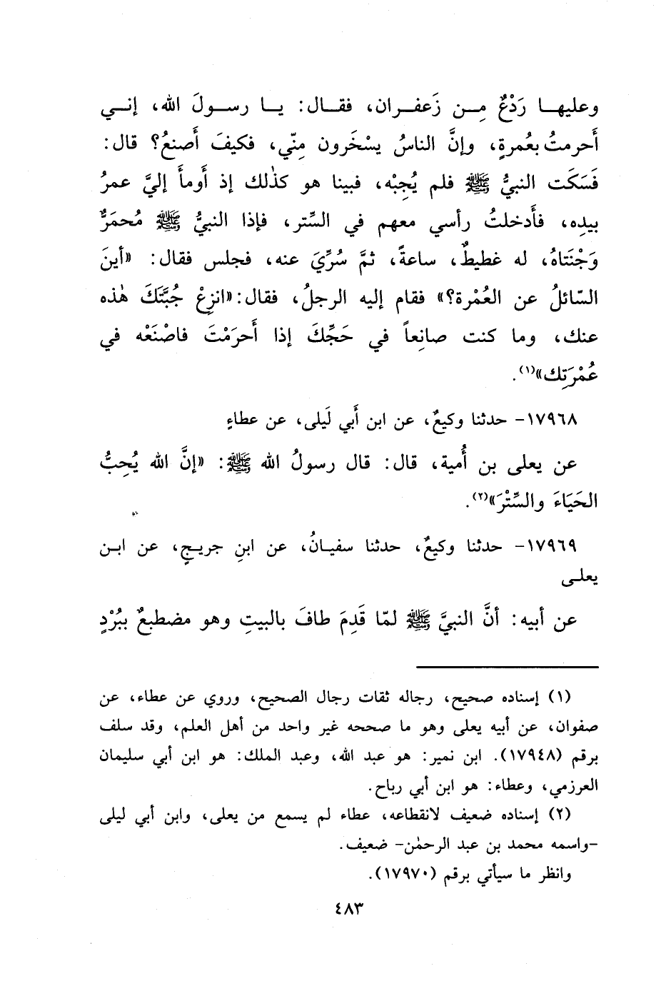 ١٧٩٦٨ - حَدَّثَنَا وَكِيعٌ، عَنِ ابْنِ أَبِي لَيْلَى، عَنْ عَطَاءٍ، عَنْ يَعْلَى بْنِ أُمَيَّةَ، قَالَ: قَالَ رَسُولُ اللهِ صَلَّى اللهُ عَلَيْهِ وَسَلَّمَ: " إِنَّ اللهَ يُحِبُّ الْحَيَاءَ وَالسَّتْرَ " (٢)