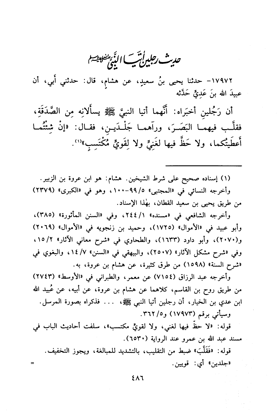 ١٧٩٧٢ - حَدَّثَنَا يَحْيَى بْنُ سَعِيدٍ، عَنْ هِشَامٍ، قَالَ: حَدَّثَنِي أَبِي أَنَّ عُبَيْدَ اللهِ بْنَ عَدِيٍّ، حَدَّثَهُ أَنَّ رَجُلَيْنِ أَخْبَرَاهُ أَنَّهُمَا أَتَيَا النَّبِيَّ صَلَّى اللهُ عَلَيْهِ وَسَلَّمَ يَسْأَلَانِهِ مِنَ الصَّدَقَةِ، فَقَلَّبَ فِيهِمَا الْبَصَرَ، وَرَآهُمَا جَلْدَيْنِ، فَقَالَ: " إِنْ شِئْتُمَا أَعْطَيْتُكُمَا، وَلَا حَظَّ فِيهَا لِغَنِيٍّ، وَلَا لِقَوِيٍّ مُكْتَسِبٍ " (١)