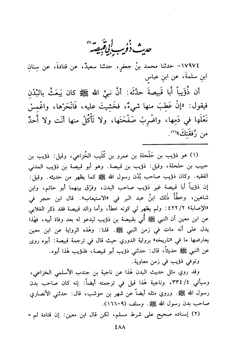 (١) هو ذؤيب بن حَلْحلة بن عمرو بن كُلَيب الخُزاعي، وقيل: ذؤيب بن حبيب بن حلحلة، وقيل: ذؤيب بن قبيصة. وهو أبو قبيصة بن ذؤيب المدني الفقيه. وكان ذؤيب صاحب بُدْن رسول الله صَلَّى اللهُ عَلَيْهِ وَسَلَّمَ كما يظهر من حديثه. وقيل: إن ذؤيباً أبا قبيصة غير ذؤيب صاحب البدن، وفرّق بينهما أبو حاتم، وابن شاهين، وخطَّأَ ذلك ابنُ عبد البر في "الاستيعاب". قال ابن حجر في "الإصابة" ٢/٤٢٢: ولم يظهر لي كونه خطأ، وأما والد قبيصة فقد ذكر الغلابي عن ابن معين أن النبي صَلَّى اللهُ عَلَيْهِ وَسَلَّمَ أُتي بقبيصة بن ذؤيب ليدعو له بعد وفاة أبيه، فهذا يدل على أنه مات في زمن النبي صَلَّى اللهُ عَلَيْهِ وَسَلَّمَ. قلنا: وهذه الرواية عن ابن معين يعارضها ما في "تاريخه" برواية الدوري حيث قال في ترجمة قبيصة: أبوه روى عن النبي صَلَّى اللهُ عَلَيْهِ وَسَلَّمَ حديثاً، قال: حدثني ذؤيب أبو قبيصة، فذؤيب هذا أبوه.
