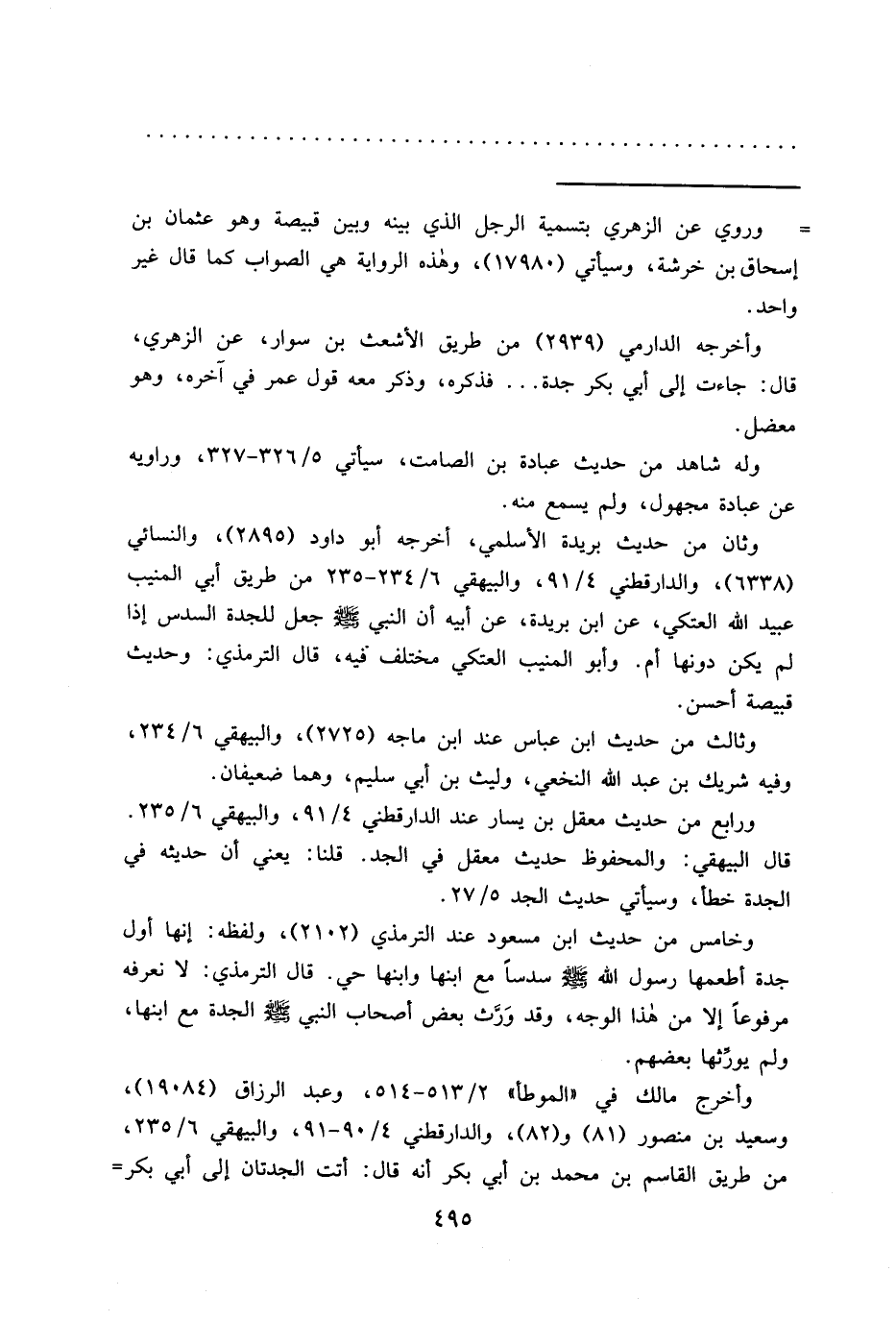 وخامس من حديث ابن مسعود عند الترمذي (٢١٠٢) ، ولفظه: إنها أول جدة أطعمها رسول الله صَلَّى اللهُ عَلَيْهِ وَسَلَّمَ سدساً مع ابنها وابنها حي. قال الترمذي: لا نعرفه مرفوعاً إلا من هذا الوجه، وقد وَرَّث بعض أصحاب النبي صَلَّى اللهُ عَلَيْهِ وَسَلَّمَ الجدة مع ابنها، ولم يورِّثها بعضهم.