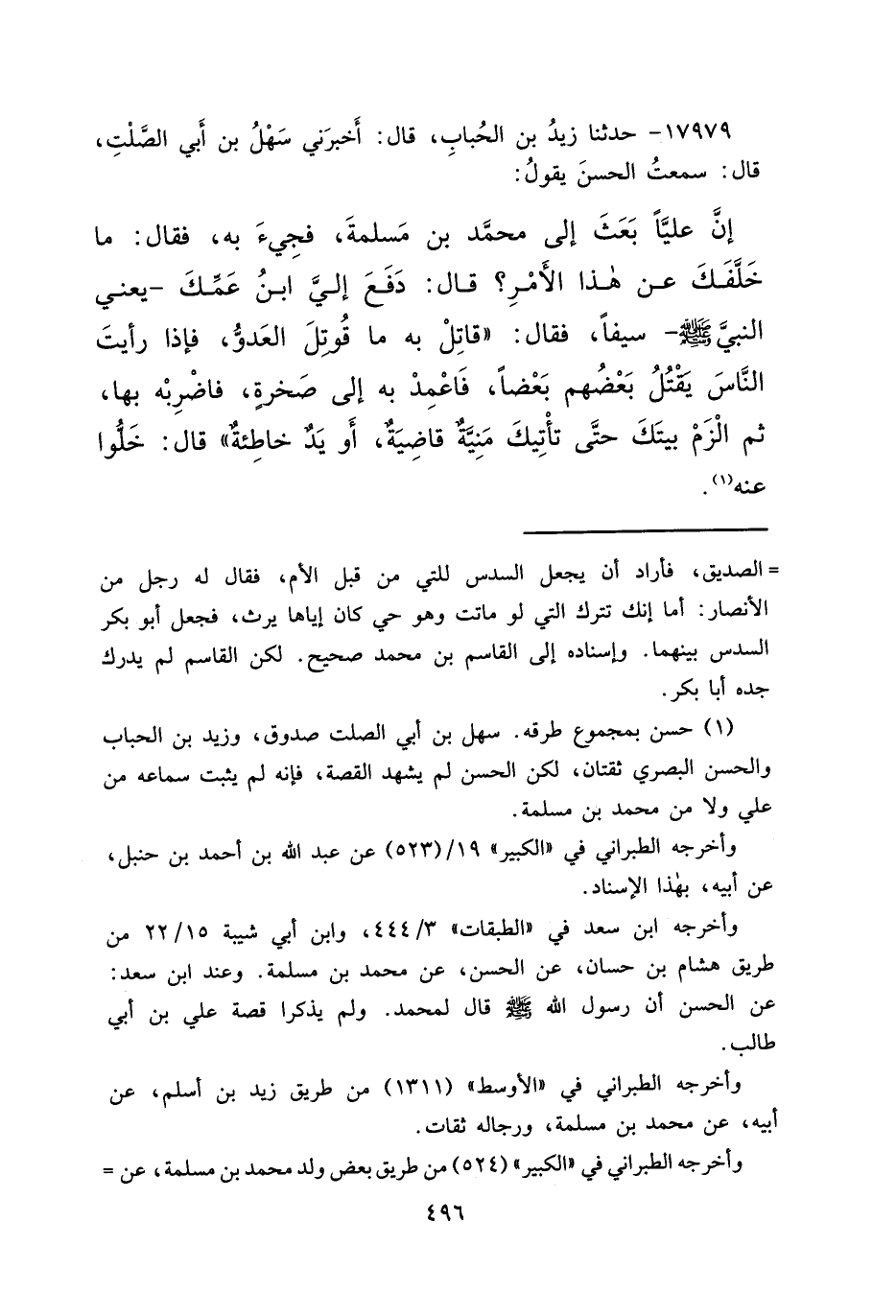 (١) حسن بمجموع طرقه. سهل بن أبي الصلت صدوق، وزيد بن الحباب والحسن البصري ثقتان، لكن الحسن لم يشهد القصة، فإنه لم يثبت سماعه من علي ولا من محمد بن مسلمة.