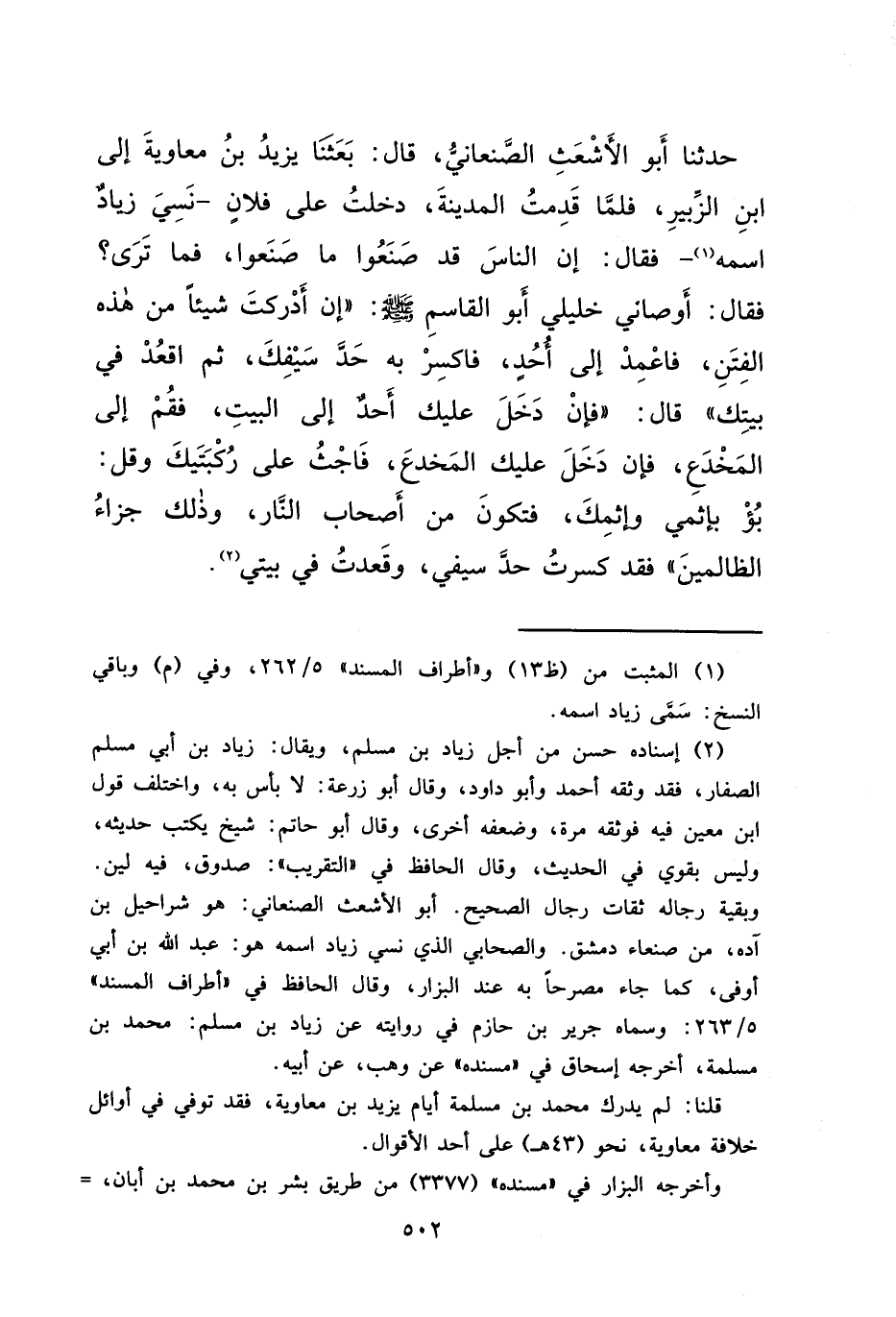 حَدَّثَنَا أَبُو الْأَشْعَثِ الصَّنْعَانِيُّ، قَالَ: بَعَثَنَا يَزِيدُ بْنُ مُعَاوِيَةَ إِلَى ابْنِ الزُّبَيْرِ، فَلَمَّا قَدِمْتُ الْمَدِينَةَ، دَخَلْتُ عَلَى فُلَانٍ - نَسِيَ زِيَادٌ اسْمَهُ (١) - فَقَالَ: إِنَّ النَّاسَ قَدْ صَنَعُوا مَا صَنَعُوا، فَمَا تَرَى؟ فَقَالَ: " أَوْصَانِي خَلِيلِي أَبُو الْقَاسِمِ صَلَّى اللهُ عَلَيْهِ وَسَلَّمَ: " إِنْ أَدْرَكْتَ شَيْئًا مِنْ هَذِهِ الْفِتَنِ، فَاعْمَدْ إِلَى أُحُدٍ، فَاكْسِرْ بِهِ حَدَّ سَيْفِكَ، ثُمَّ اقْعُدْ فِي بَيْتِكَ "، قَالَ: " فَإِنْ دَخَلَ عَلَيْكَ أَحَدٌ إِلَى الْبَيْتِ، فَقُمْ إِلَى الْمَخْدَعِ، فَإِنْ دَخَلَ عَلَيْكَ الْمَخْدَعَ فَاجْثُ عَلَى رُكْبَتَيْكَ، وَقُلْ بُؤْ بِإِثْمِي وَإِثْمِكَ، فَتَكُونَ مِنْ أَصْحَابِ النَّارِ، وَذَلِكَ جَزَاءُ الظَّالِمِينَ " فَقَدْ كَسَرْتُ حَدَّ سَيْفِي، وَقَعَدْتُ فِي بَيْتِي (٢)