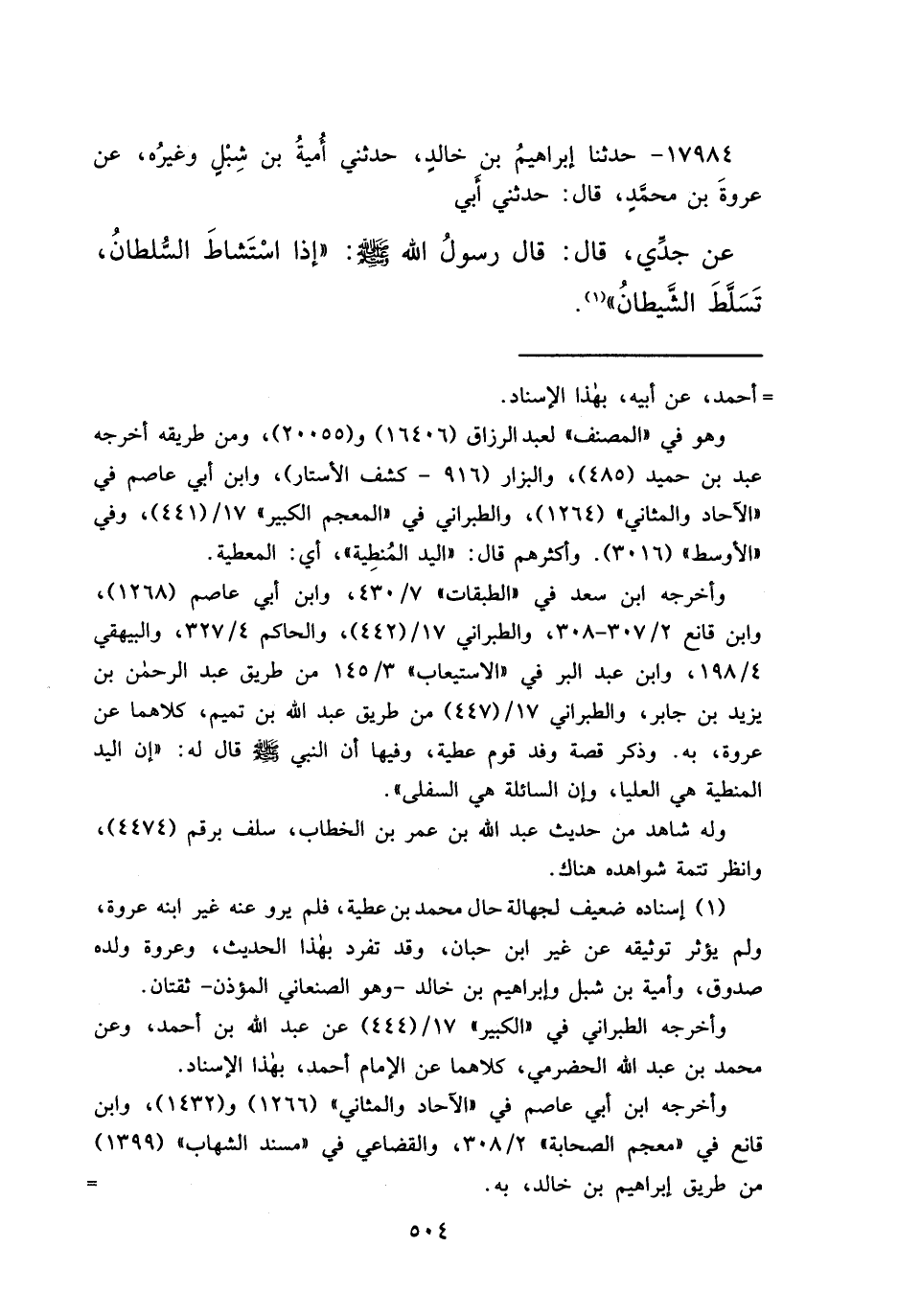 ١٧٩٨٤ - حَدَّثَنَا إِبْرَاهِيمُ بْنُ خَالِدٍ، حَدَّثَنِي أُمَيَّةُ بْنُ شِبْلٍ، وَغَيْرُهُ، عَنْ عُرْوَةَ بْنِ مُحَمَّدٍ، قَالَ: حَدَّثَنِي أَبِي، عَنْ جَدِّي، قَالَ: قَالَ رَسُولُ اللهِ صَلَّى اللهُ عَلَيْهِ وَسَلَّمَ: " إِذَا اسْتَشَاطَ السُّلْطَانُ، تَسَلَّطَ الشَّيْطَانُ " (١)
