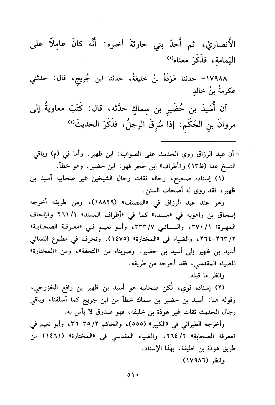 (٢) إسناده قوي، لكن صحابيه هو أسيد بن ظهير بن رافع الخزرجي، وقوله هنا: أسيد بن حضير بن سماك خطأ من ابن جريج كما أسلفنا، وباقي رجال الحديث ثقات غير هوذة بن خليفة، فهو صدوق لا بأس به.