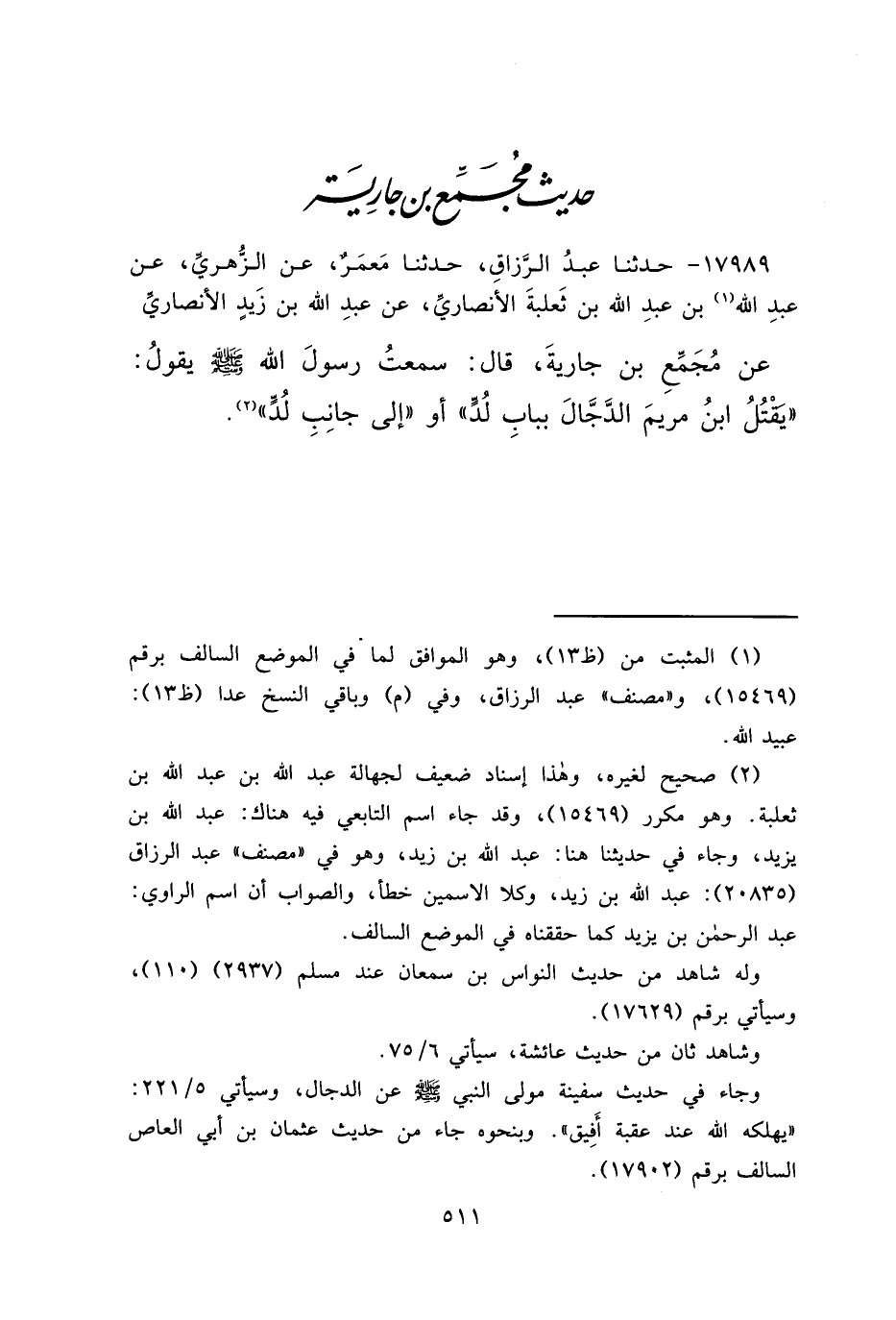 ١٧٩٨٩ - حَدَّثَنَا عَبْدُ الرَّزَّاقِ، حَدَّثَنَا مَعْمَرٌ، عَنِ الزُّهْرِيِّ، عَنْ عبد اللهِ (١) بْنِ عَبْدِ اللهِ بْنِ ثَعْلَبَةَ الْأَنْصَارِيِّ، عَنْ عَبْدِ الرَّحْمَنِ بْنِ زَيْدٍ الْأَنْصَارِيِّ، عَنْ مُجَمِّعِ بْنِ جَارِيَةَ، قَالَ: سَمِعْتُ رَسُولَ اللهِ صَلَّى اللهُ عَلَيْهِ وَسَلَّمَ يَقُولُ: " يَقْتُلُ ابْنُ مَرْيَمَ الدَّجَّالَ بِبَابِ لُدٍّ " أَوْ " إِلَى جَانِبِ لُدٍّ " (٢)