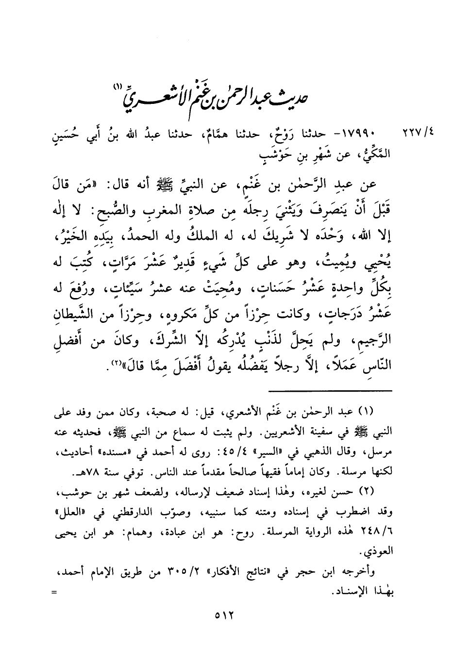 ١٧٩٩٠ - حَدَّثَنَا رَوْحٌ، حَدَّثَنَا هَمَّامٌ، حَدَّثَنَا عَبْدُ اللهِ بْنُ أَبِي حُسَيْنٍ الْمَكِّيُّ، عَنْ شَهْرِ بْنِ حَوْشَبٍ، عَنْ عَبْدِ الرَّحْمَنِ بْنِ غَنْمٍ، عَنِ النَّبِيِّ صَلَّى اللهُ عَلَيْهِ وَسَلَّمَ أَنَّهُ قَالَ: " مَنْ قَالَ قَبْلَ أَنْ يَنْصَرِفَ وَيَثْنِيَ رِجْلَهُ مِنْ صَلَاةِ الْمَغْرِبِ، وَالصُّبْحِ: لَا إِلَهَ إِلَّا اللهُ، وَحْدَهُ لَا شَرِيكَ لَهُ، لَهُ الْمُلْكُ وَلَهُ الْحَمْدُ، بِيَدِهِ الْخَيْرُ، يُحْيِي وَيُمِيتُ، وَهُوَ عَلَى كُلِّ شَيْءٍ قَدِيرٌ عَشْرَ مَرَّاتٍ، كُتِبَ لَهُ بِكُلِّ وَاحِدَةٍ عَشْرُ حَسَنَاتٍ، وَمُحِيَتْ عَنْهُ عَشْرُ سَيِّئَاتٍ، وَرُفِعَ لَهُ عَشْرُ دَرَجَاتٍ، وَكَانَتْ حِرْزًا مِنْ كُلِّ مَكْرُوهٍ، وَحِرْزًا مِنَ الشَّيْطَانِ الرَّجِيمِ، وَلَمْ يَحِلَّ لِذَنْبٍ يُدْرِكُهُ إِلَّا الشِّرْكَ، وَكَانَ مِنْ أَفْضَلِ النَّاسِ عَمَلًا، إِلَّا رَجُلًا يَفْضُلُهُ، يَقُولُ: أَفْضَلَ مِمَّا قَالَ " (٢)
