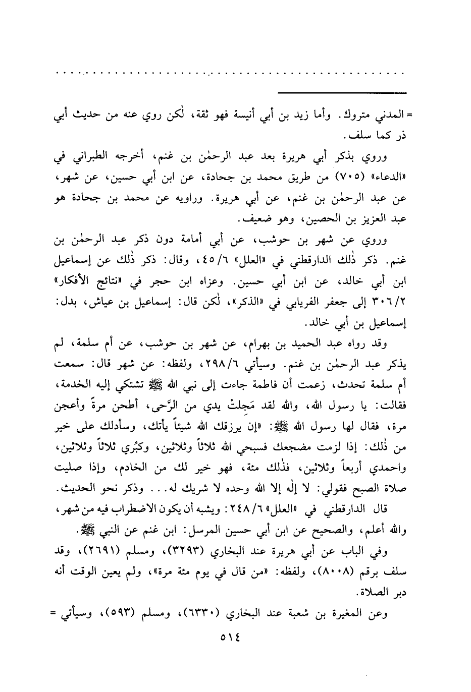وقد رواه عبد الحميد بن بهرام، عن شهر بن حوشب، عن أم سلمة، لم يذكر عبد الرحمن بن غنم. وسيأتي ٦/٢٩٨، ولفظه: عن شهر قال: سمعت أم سلمة تحدث، زعمت أن فاطمة جاءت إلى نبي الله صَلَّى اللهُ عَلَيْهِ وَسَلَّمَ تشتكي إليه الخدمة، فقالت: يا رسول الله، والله لقد مَجِلتْ يدي من الرَّحى، أطحن مرةً وأعجن مرة، فقال لها رسول الله صَلَّى اللهُ عَلَيْهِ وَسَلَّمَ: "إن يرزقك الله شيئاً يأتك، وسأدلك على خير من ذلك: إذا لزمت مضجعك فسبحي الله ثلاثاً وثلاثين، وكبِّري ثلاثاً وثلاثين،