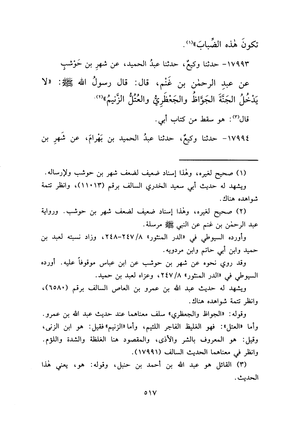 ١٧٩٩٣ - حَدَّثَنَا وَكِيعٌ، حَدَّثَنَا عَبْدُ الْحَمِيدِ، عَنْ شَهْرِ بْنِ حَوْشَبٍ، عَنْ عَبْدِ الرَّحْمَنِ بْنِ غَنْمٍ، قَالَ: قَالَ رَسُولُ اللهِ صَلَّى اللهُ عَلَيْهِ وَسَلَّمَ: " لَا يَدْخُلُ الْجَنَّةَ الْجَوَّاظُ وَالْجَعْظَرِيُّ وَالْعُتُلُّ الزَّنِيمُ " (٢) " قَالَ (٣) : هُوَ سَقَطَ مِنْ كِتَابِ أَبِي "