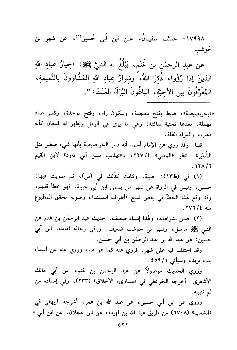 ١٧٩٩٨ - حَدَّثَنَا سُفْيَانُ، عَنِ ابْنِ أَبِي حُسَيْنٍ (١) ، عَنْ شَهْرِ بْنِ حَوْشَبٍ، عَنْ عَبْدِ الرَّحْمَنِ بْنِ غَنْمٍ، يَبْلُغُ بِهِ النَّبِيَّ صَلَّى اللهُ عَلَيْهِ وَسَلَّمَ: " خِيَارُ عِبَادِ اللهِ الَّذِينَ إِذَا رُءُوا، ذُكِرَ اللهُ، وَشِرَارُ عِبَادِ اللهِ الْمَشَّاءُونَ بِالنَّمِيمَةِ، الْمُفَرِّقُونَ بَيْنَ الْأَحِبَّةِ، الْبَاغُونَ الْبُرَآءَ الْعَنَتَ (٢)