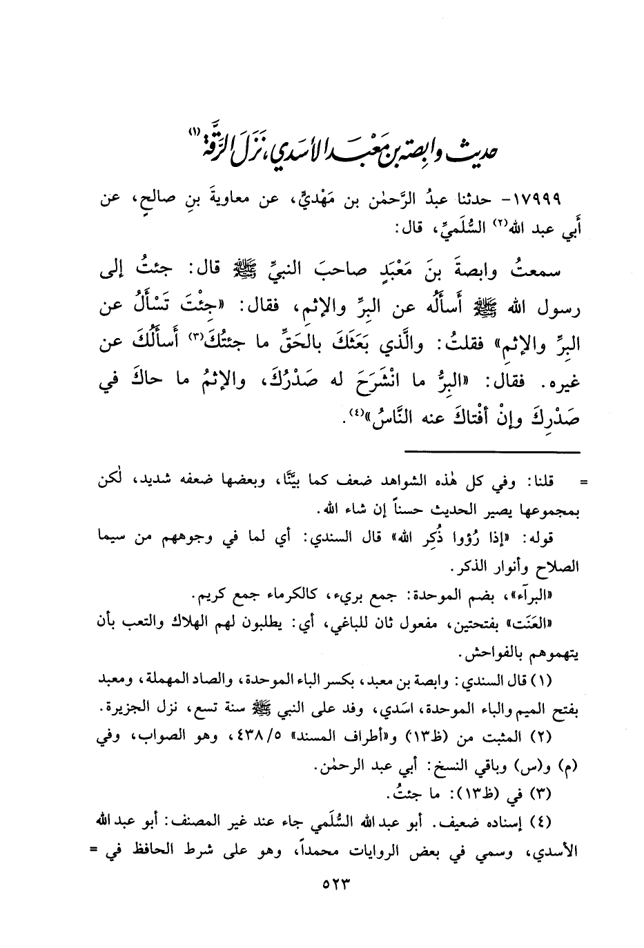 ١٧٩٩٩ - حَدَّثَنَا عَبْدُ الرَّحْمَنِ بْنُ مَهْدِيٍّ، عَنْ مُعَاوِيَةَ بْنِ صَالِحٍ، عَنْ أَبِي عَبْدِ اللهِ (٢) السُّلَمِيِّ، قَالَ: سَمِعْتُ وَابِصَةَ بْنَ مَعْبَدٍ صَاحِبَ النَّبِيِّ صَلَّى اللهُ عَلَيْهِ وَسَلَّمَ قَالَ: جِئْتُ إِلَى رَسُولِ اللهِ صَلَّى اللهُ عَلَيْهِ وَسَلَّمَ أَسْأَلُهُ عَنِ الْبِرِّ وَالْإِثْمِ، فَقَالَ: " جِئْتَ تَسْأَلُ عَنِ الْبِرِّ، وَالْإِثْمِ " فَقُلْتُ: وَالَّذِي بَعَثَكَ بِالْحَقِّ مَا جِئْتُكَ (٣) أَسْأَلُكَ عَنْ غَيْرِهِ، فَقَالَ: " الْبِرُّ مَا انْشَرَحَ لَهُ صَدْرُكَ، وَالْإِثْمُ مَا حَاكَ فِي صَدْرِكَ، وَإِنْ أَفْتَاكَ عَنْهُ النَّاسُ " (٤)