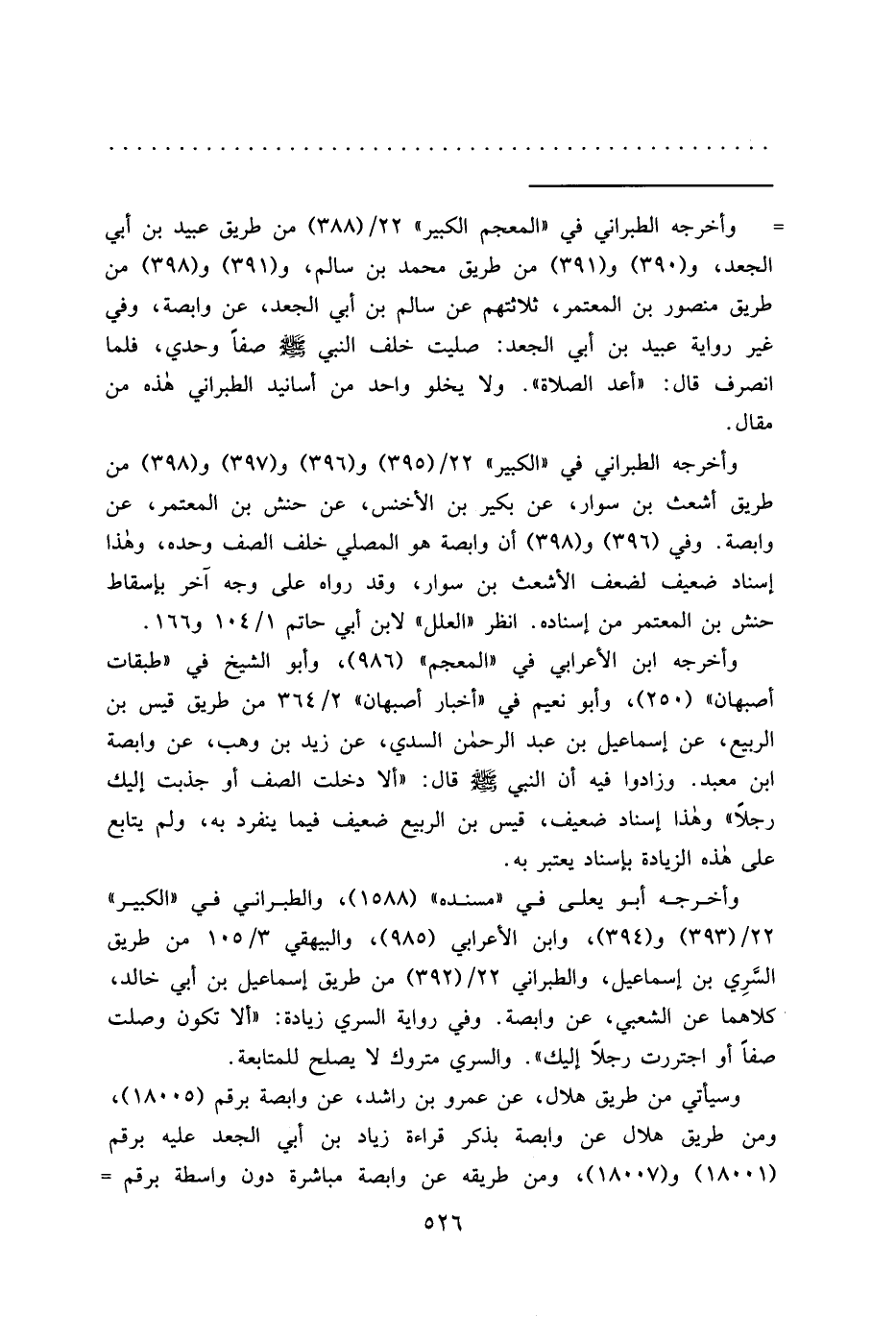 وأخرجه ابن الأعرابي في "المعجم" (٩٨٦) ، وأبو الشيخ في "طبقات أصبهان" (٢٥٠) ، وأبو نعيم في "أخبار أصبهان" ٢/٣٦٤ من طريق قيس بن الربيع، عن إسماعيل بن عبد الرحمن السدي، عن زيد بن وهب، عن وابصة ابن معبد. وزادوا فيه أن النبي صَلَّى اللهُ عَلَيْهِ وَسَلَّمَ قال: "ألا دخلت الصف أو جذبت إليك رجلاً" وهذا إسناد ضعيف، قيس بن الربيع ضعيف فيما ينفرد به، ولم يتابع