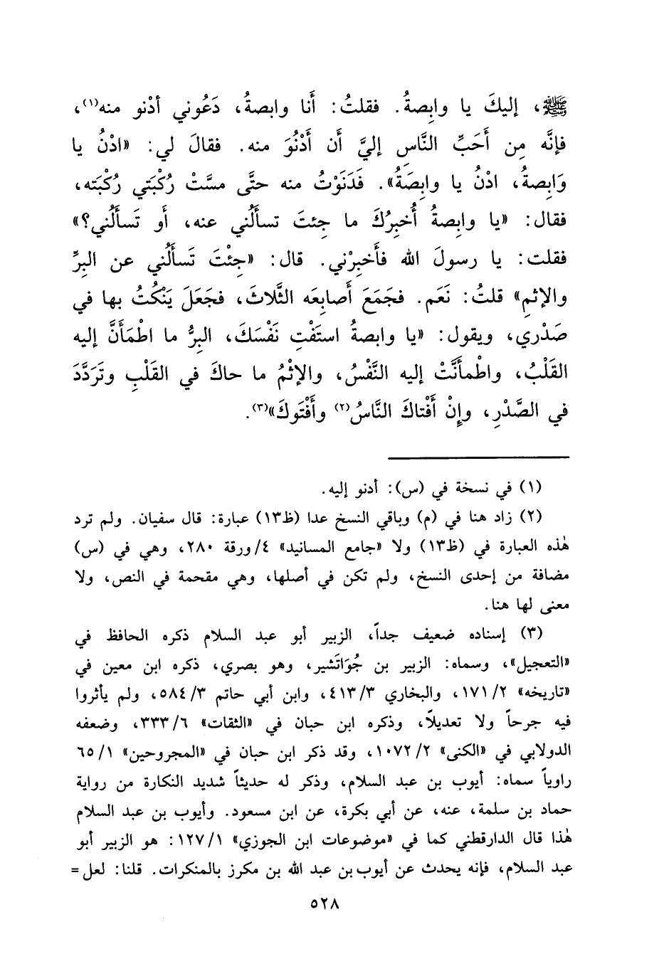 إِلَيْكَ يَا وَابِصَةُ، فَقُلْتُ: أَنَا وَابِصَةُ، دَعُونِي أَدْنُو مِنْهُ (١) ، فَإِنَّهُ مِنْ أَحَبِّ النَّاسِ إِلَيَّ أَنْ أَدْنُوَ مِنْهُ، فَقَالَ لِي: " ادْنُ يَا وَابِصَةُ، ادْنُ يَا وَابِصَةُ "، فَدَنَوْتُ مِنْهُ حَتَّى مَسَّتْ رُكْبَتِي رُكْبَتَهُ، فَقَالَ: " يَا وَابِصَةُ أُخْبِرُكَ مَا جِئْتَ تَسْأَلُنِي عَنْهُ، أَوْ تَسْأَلُنِي؟ " فَقُلْتُ: يَا رَسُولَ اللهِ فَأَخْبِرْنِي، قَالَ: " جِئْتَ تَسْأَلُنِي عَنِ الْبِرِّ وَالْإِثْمِ؟ " قُلْتُ: نَعَمْ، فَجَمَعَ أَصَابِعَهُ الثَّلَاثَ فَجَعَلَ يَنْكُتُ بِهَا فِي صَدْرِي، وَيَقُولُ: " يَا وَابِصَةُ اسْتَفْتِ نَفْسَكَ، الْبِرُّ مَا اطْمَأَنَّ إِلَيْهِ الْقَلْبُ، وَاطْمَأَنَّتْ إِلَيْهِ النَّفْسُ، وَالْإِثْمُ مَا حَاكَ فِي الْقَلْبِ، وَتَرَدَّدَ فِي الصَّدْرِ، وَإِنْ أَفْتَاكَ النَّاسُ (٢) وَأَفْتَوْكَ " (٣)