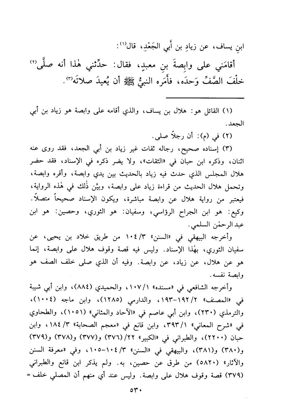 و (٣٨٠) و (٣٨١) ، والبيهقي في "السنن" ٣/١٠٤-١٠٥، وفي "معرفة السنن والآثار" (٥٨٢٠) من طرق عن حصين، به. ولم يذكر ابن قانع والطبراني (٣٧٩) قصة وقوف هلال على وابصة. وليس عند أي منهم أن المصلي خلف=