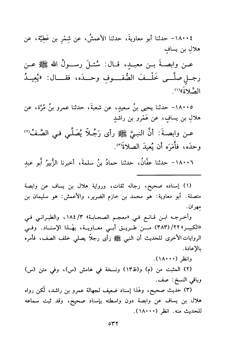 ١٨٠٠٥ - حَدَّثَنَا يَحْيَى بْنُ سَعِيدٍ، عَنْ شُعْبَةَ، حَدَّثَنَا عَمْرُو بْنُ مُرَّةَ، عَنْ هِلَالِ بْنِ يِسَافٍ، عَنْ عَمْرِو بْنِ رَاشِدٍ، عَنْ وَابِصَةَ: " أَنَّ النَّبِيَّ صَلَّى اللهُ عَلَيْهِ وَسَلَّمَ رَأَى رَجُلًا يُصَلِّي فِي الصَّفِّ (٢) وَحْدَهُ، فَأَمَرَهُ أَنْ يُعِيدَ الصَّلَاةَ " (٣)