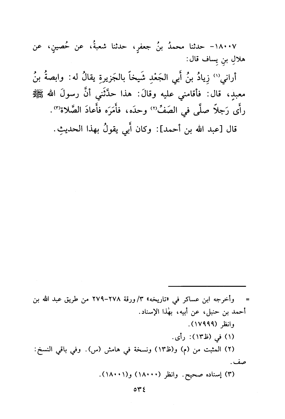 ١٨٠٠٧ - حَدَّثَنَا مُحَمَّدُ بْنُ جَعْفَرٍ، حَدَّثَنَا شُعْبَةُ، عَنْ حُصَيْنٍ، عَنْ هِلَالِ بْنِ يِسَافٍ، قَالَ: أَرَانِي (١) زِيَادُ بْنُ أَبِي الْجَعْدِ شَيْخًا بِالْجَزِيرَةِ يُقَالُ لَهُ: وَابِصَةُ بْنُ مَعْبَدٍ، قَالَ: فَأَقَامَنِي عَلَيْهِ، وَقَالَ: " هَذَا حَدَّثَنِي أَنَّ رَسُولَ اللهِ صَلَّى اللهُ عَلَيْهِ وَسَلَّمَ رَأَى رَجُلًا صَلَّى فِي الصَّفِّ (٢) وَحْدَهُ، فَأَمَرَهُ فَأَعَادَ الصَّلَاةَ (٣) قَالَ عَبْدُ اللهِ بْنُ أَحْمَدَ: " وَكَانَ أَبِي يَقُولُ بِهَذَا الْحَدِيثِ "