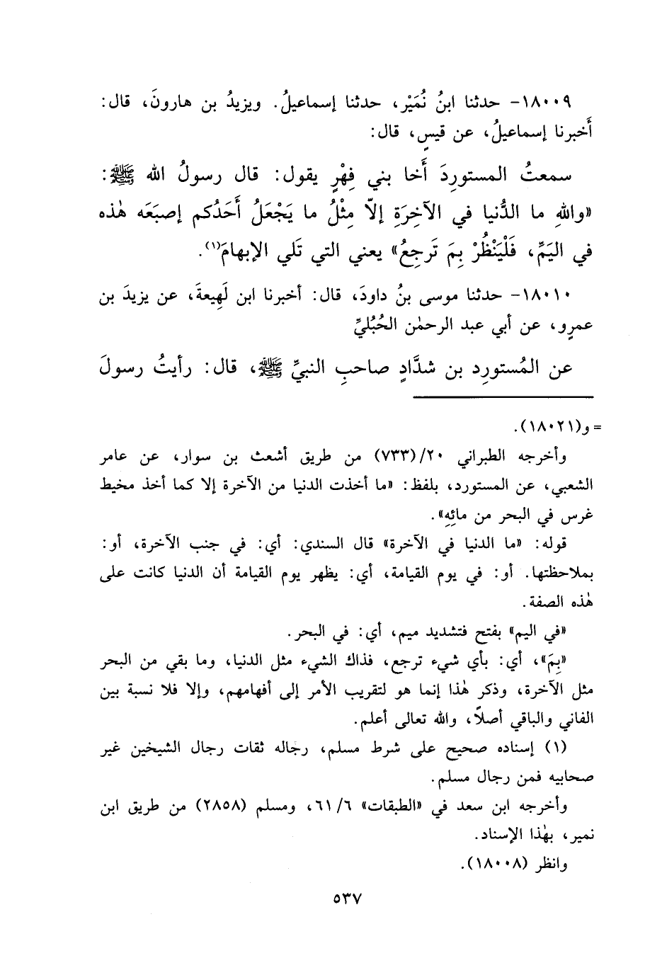 ١٨٠٠٩ - حَدَّثَنَا ابْنُ نُمَيْرٍ، حَدَّثَنَا إِسْمَاعِيلُ، وَيَزِيدُ بْنُ هَارُونَ، قَالَ: أَخْبَرَنَا إِسْمَاعِيلُ، عَنْ قَيْسٍ، قَالَ: سَمِعْتُ الْمُسْتَوْرِدَ، أَخَا بَنِي فِهْرٍ يَقُولُ: قَالَ رَسُولُ اللهِ صَلَّى اللهُ عَلَيْهِ وَسَلَّمَ: " وَاللهِ مَا الدُّنْيَا فِي الْآخِرَةِ إِلَّا مِثْلُ مَا يَجْعَلُ أَحَدُكُمْ إِصْبَعَهُ هَذِهِ فِي الْيَمِّ، فَلْيَنْظُرْ بِمَ تَرْجِعُ " يَعْنِي الَّتِي تَلِي الْإِبْهَامَ (١)