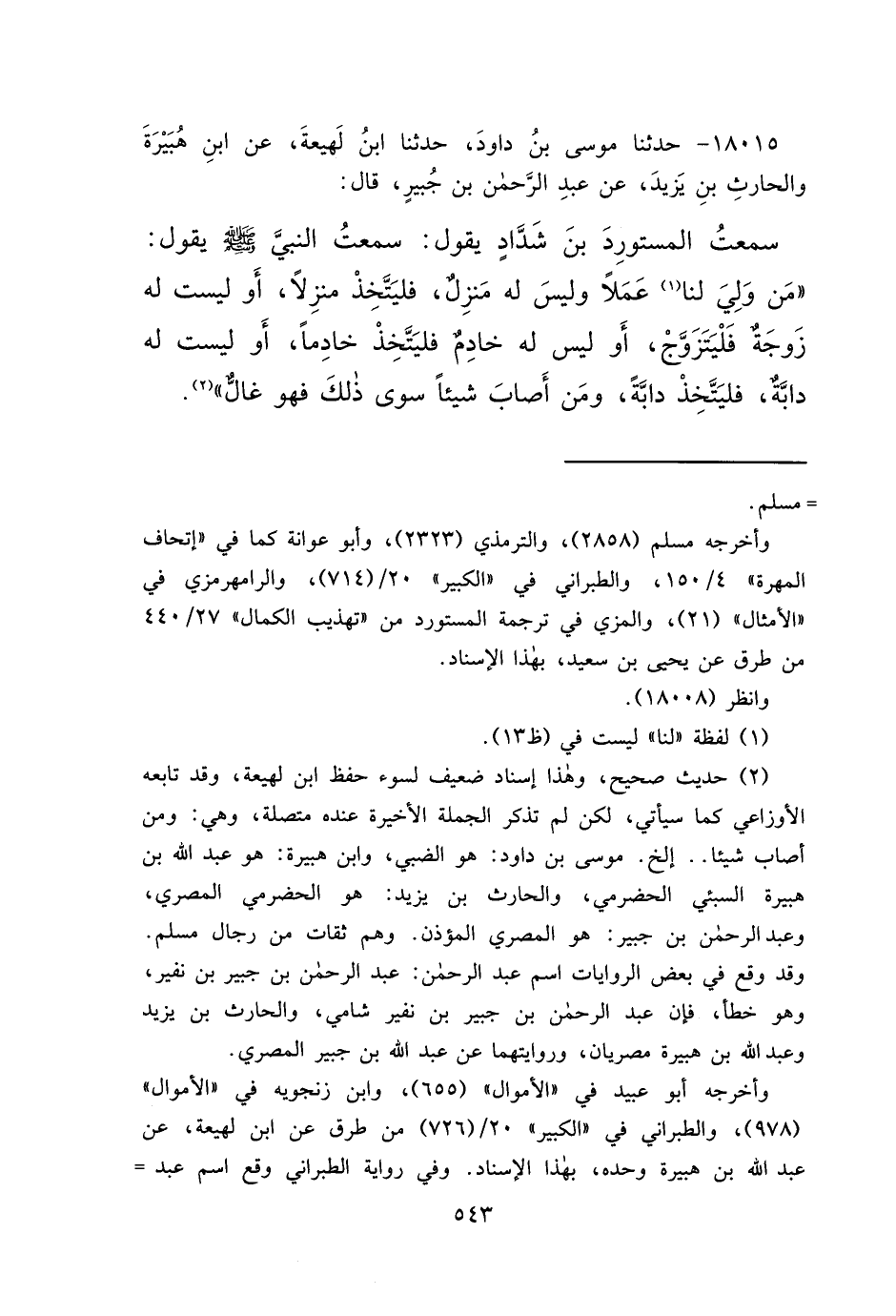 ١٨٠١٥ - حَدَّثَنَا مُوسَى بْنُ دَاوُدَ، حَدَّثَنَا ابْنُ لَهِيعَةَ، عَنِ ابْنِ هُبَيْرَةَ، والْحَارِثُ بْنُ يَزِيدَ، عَنْ عَبْدِ الرَّحْمَنِ بْنِ جُبَيْرٍ، قَالَ: سَمِعْتُ الْمُسْتَوْرِدَ بْنَ شَدَّادٍ، يَقُولُ: سَمِعْتُ النَّبِيَّ صَلَّى اللهُ عَلَيْهِ وَسَلَّمَ يَقُولُ: " مَنْ وَلِيَ لَنَا (١) عَمَلًا وَلَيْسَ لَهُ مَنْزِلٌ، فَلْيَتَّخِذْ مَنْزِلًا، أَوْ لَيْسَتْ لَهُ زَوْجَةٌ فَلْيَتَزَوَّجْ، أَوْ لَيْسَ لَهُ خَادِمٌ فَلْيَتَّخِذْ خَادِمًا، أَوْ لَيْسَتْ لَهُ دَابَّةٌ فَلْيَتَّخِذْ دَابَّةً، وَمَنْ أَصَابَ شَيْئًا سِوَى ذَلِكَ فَهُوَ غَالٌّ " (٢)