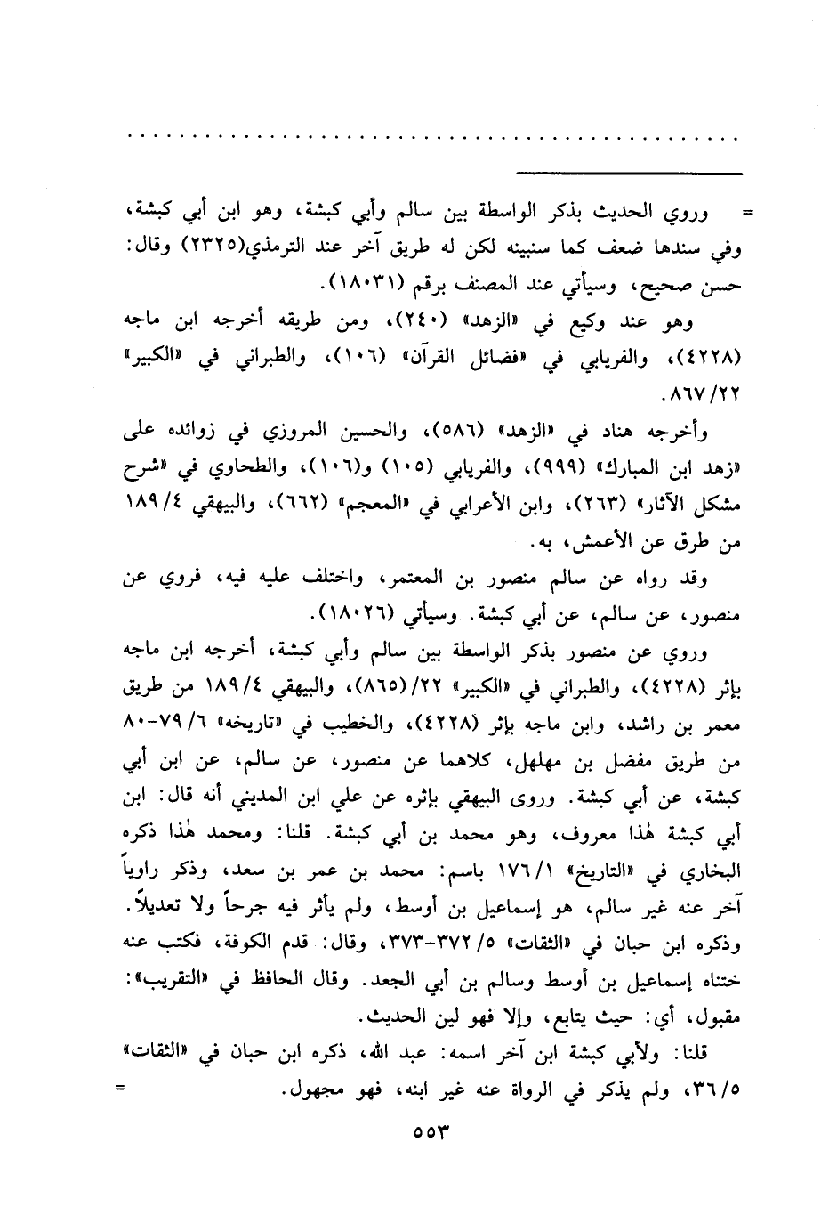 = وروي الحديث بذكر الواسطة بين سالم وأبي كبشة، وهو ابن أبي كبشة، وفي سندها ضعف كما سنبينه لكن له طريق آخر عند الترمذي (٢٣٢٥) وقال: حسن صحيح، وسيأتي عند المصنف برقم (١٨٠٣١) .