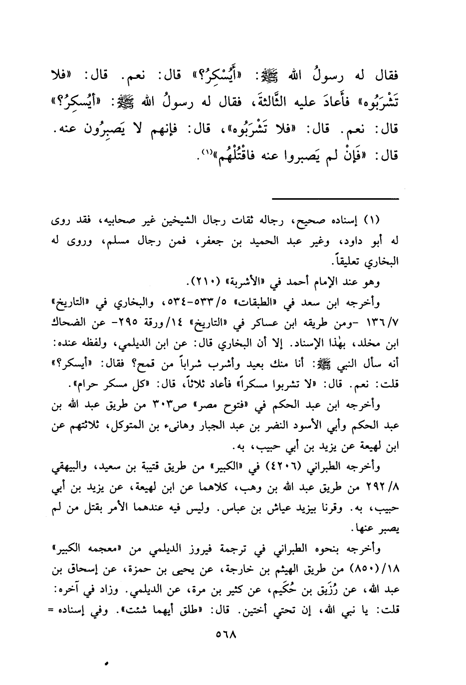 فَقَالَ لَهُ رَسُولُ اللهِ صَلَّى اللهُ عَلَيْهِ وَسَلَّمَ: " أَيُسْكِرُ؟ " قَالَ: نَعَمْ، قَالَ: " فَلَا تَشْرَبُوهُ " فَأَعَادَ عَلَيْهِ الثَّالِثَةَ، فَقَالَ لَهُ رَسُولُ اللهِ صَلَّى اللهُ عَلَيْهِ وَسَلَّمَ: " أَيُسْكِرُ؟ " قَالَ: نَعَمْ قَالَ: " فَلَا تَشْرَبُوهُ " قَالَ: " فَإِنَّهُمْ لَا يَصْبِرُونَ عَنْهُ " قَالَ: " فَإِنْ لَمْ يَصْبِرُوا عَنْهُ فَاقْتُلْهُمْ " (١)
