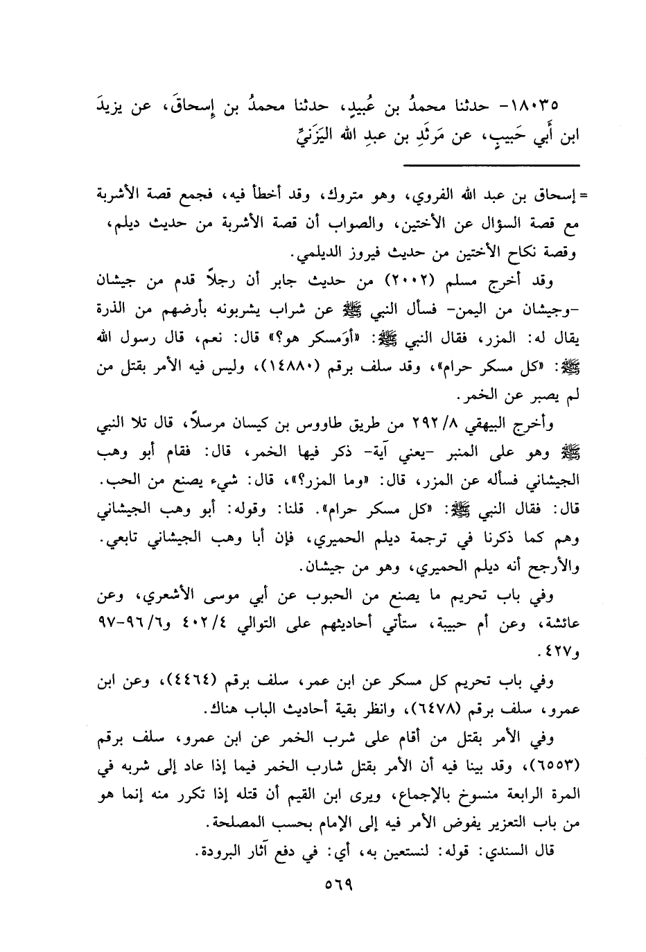 وقد أخرج مسلم (٢٠٠٢) من حديث جابر أن رجلاً قدم من جيشان - وجيشان من اليمن- فسأل النبي صَلَّى اللهُ عَلَيْهِ وَسَلَّمَ عن شراب يشربونه بأرضهم من الذرة يقال له: المزر، فقال النبي صَلَّى اللهُ عَلَيْهِ وَسَلَّمَ: "أوَمسكر هو؟ " قال: نعم، قال رسول الله صَلَّى اللهُ عَلَيْهِ وَسَلَّمَ: "كل مسكر حرام "، وقد سلف برقم (١٤٨٨٠) ، وليس فيه الأمر بقتل من لم يصبر عن الخمر.