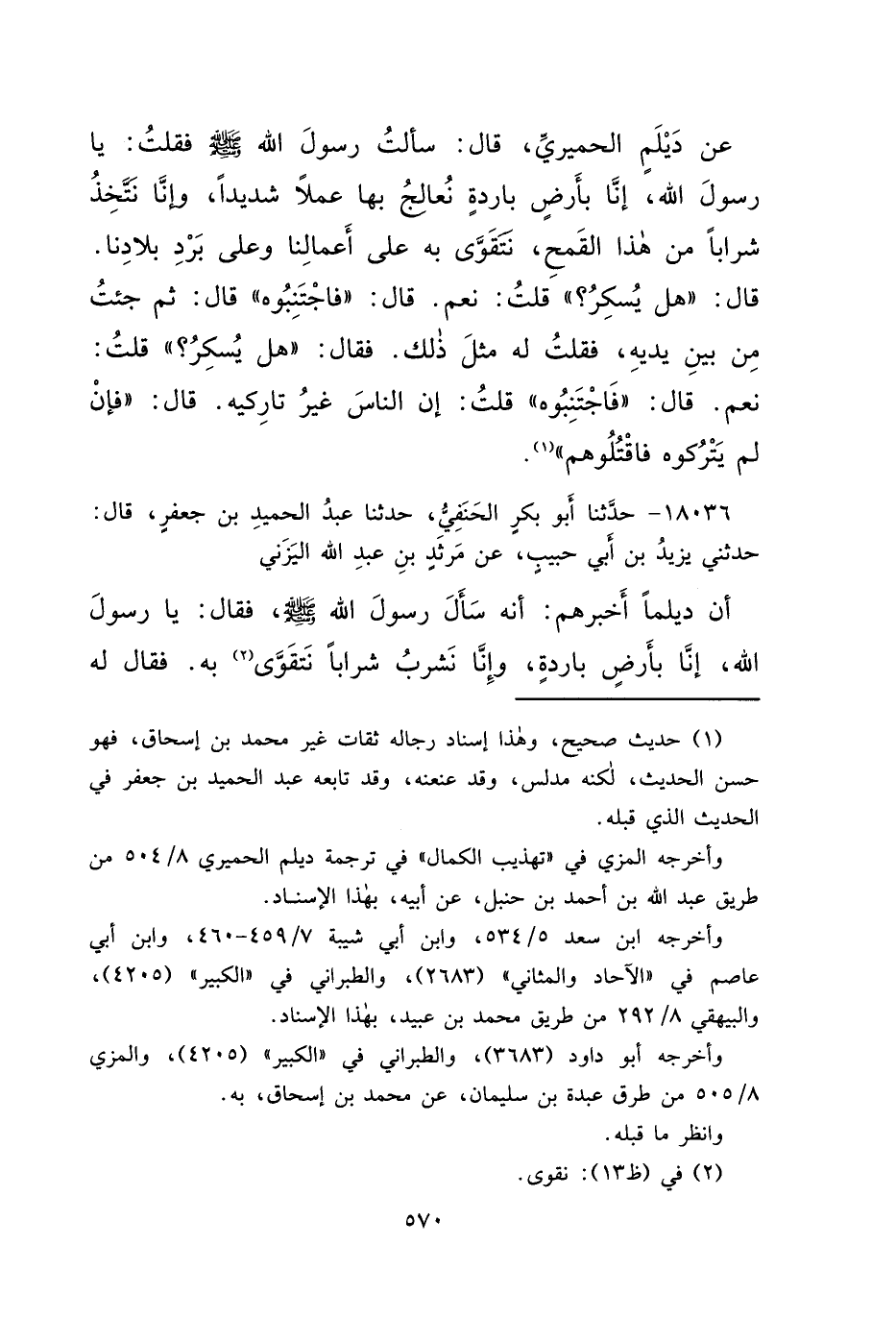 ١٨٠٣٦ - حَدَّثَنَا أَبُو بَكْرٍ الْحَنَفِيُّ، حَدَّثَنَا عَبْدُ الْحَمِيدِ بْنُ جَعْفَرٍ، قَالَ: حَدَّثَنِي يَزِيدُ بْنُ أَبِي حَبِيبٍ، عَنْ مَرْثَدِ بْنِ عَبْدِ اللهِ الْيَزَنِيِّ، أَنَّ دَيْلَمًا أَخْبَرَهُمْ: أَنَّهُ سَأَلَ رَسُولَ اللهِ صَلَّى اللهُ عَلَيْهِ وَسَلَّمَ، فَقَالَ: يَا رَسُولَ اللهِ، إِنَّا بِأَرْضٍ بَارِدَةٍ، وَإِنَّا نَشْرَبُ شَرَابًا نَتَقَوَّى (٢) بِهِ، فَقَالَ لَهُ