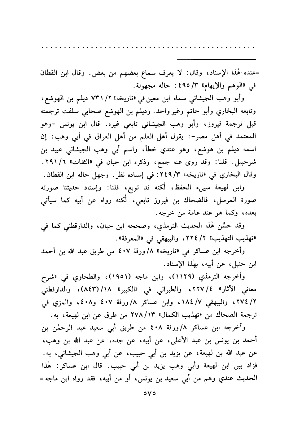 وأبو وهب الجيشاني سماه ابن معين في "تاريخه" ٢/٧٣١ ديلم بن الهوشع، وتابعه البخاري وأبو حاتم وغير واحد. وديلم بن الهوشع صحابي سلفت ترجمته قبل ترجمة فيروز، وأبو وهب الجيشاني تابعي غيره. قال ابن يونس- وهو المعتمد في أهل مصر-: يقول أهل العلم من أهل العراق في أبي وهب: إن اسمه ديلم بن هوشع، وهو عندي خطأ، واسم أبي وهب الجيشاني عبيد بن شرحبيل. قلنا: وقد روى عنه جمع، وذكره ابن حبان في "الثقات" ٦/٢٩١.