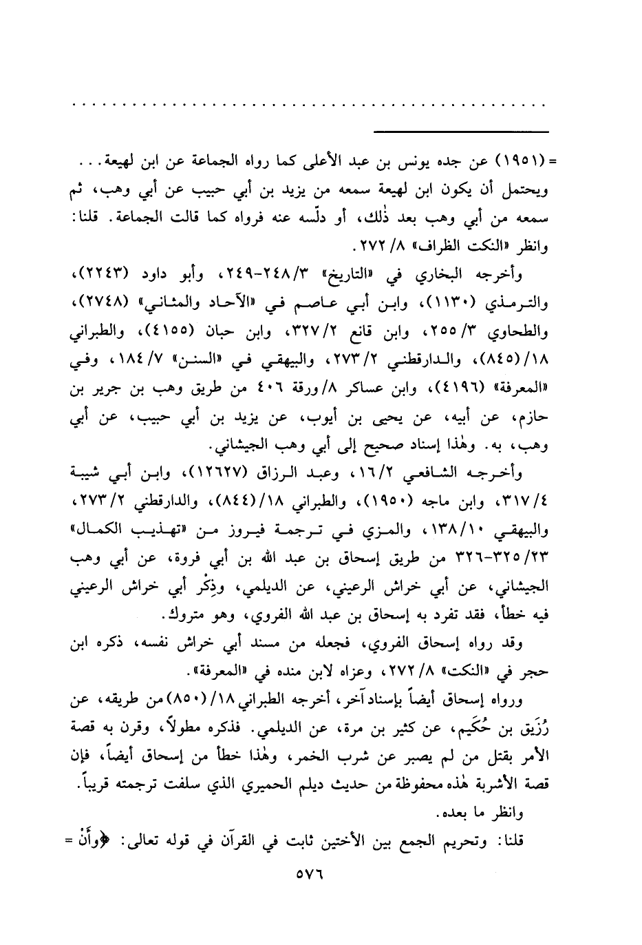 = (١٩٥١) عن جده يونس بن عبد الأعلى كما رواه الجماعة عن ابن لهيعة ... ويحتمل أن يكون ابن لهيعة سمعه من يزيد بن أبي حبيب عن أبي وهب، ثم سمعه من أبي وهب بعد ذلك، أو دلّسه عنه فرواه كما قالت الجماعة. قلنا: وانظر "النكت الظراف" ٨/٢٧٢.