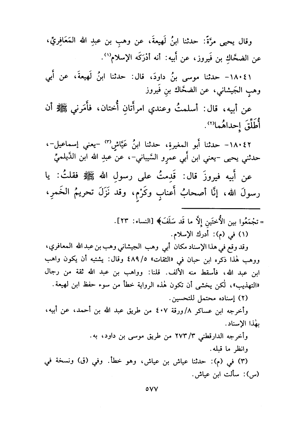١٨٠٤١ - حَدَّثَنَا مَوسَى بْنُ دَاوُدَ، قَالَ: حَدَّثَنَا ابْنُ لَهِيعَةَ، عَنْ أَبِي وَهْبٍ الْجَيْشَانِيِّ، عَنِ الضَّحَّاكِ بْنِ فَيْرُوزَ، عَنْ أَبِيهِ، قَالَ: " أَسْلَمْتُ وَعِنْدِي امْرَأَتَانِ أُخْتَانِ، فَأَمَرَنِي النَّبِيُّ صَلَّى اللهُ عَلَيْهِ وَسَلَّمَ أَنْ أُطَلِّقَ إِحْدَاهُمَا " (٢)