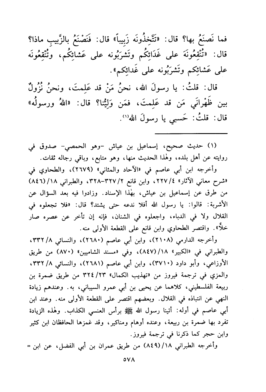 النهي عن انتباذه في القلال. وبعضهم اقتصر على القطعة الأولى منه. وعند ابن أبي عاصم في أوله: أتينا رسول الله صَلَّى اللهُ عَلَيْهِ وَسَلَّمَ برأس العنسي الكذاب. وهذه الزيادة تفرد بها ضمرة بن ربيعة، وعنده أوهام ومناكير، وقد غمزها الحافظان ابن كثير وابن حجر كما ذكرنا في ترجمة فيروز.