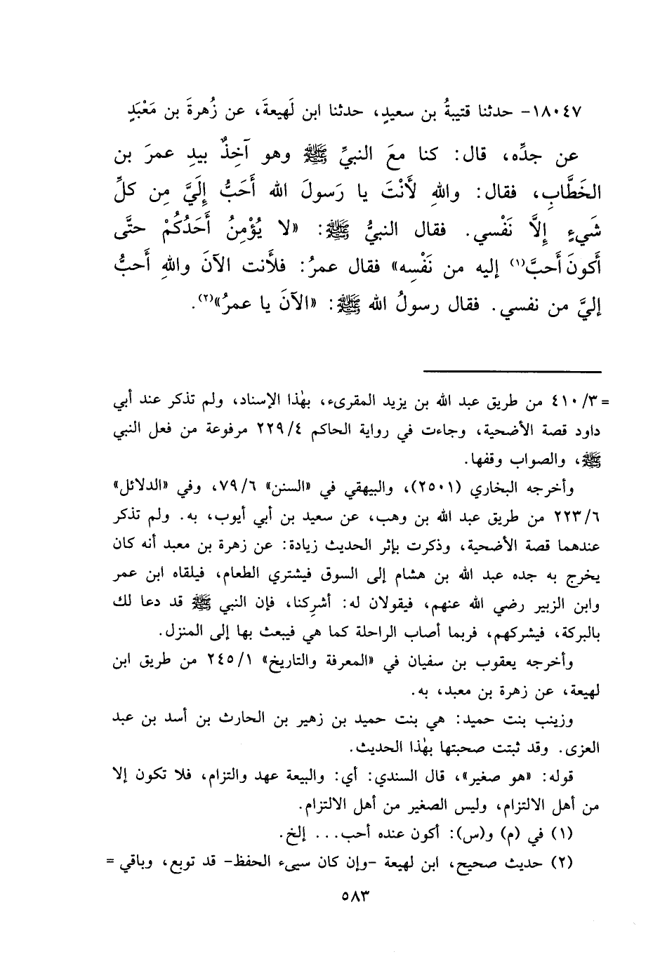 ١٨٠٤٧ - حَدَّثَنَا قُتَيْبَةُ بْنُ سَعِيدٍ، حَدَّثَنَا ابْنُ لَهِيعَةَ، عَنْ زُهْرَةَ بْنِ مَعْبَدٍ، عَنْ جَدِّهِ، قَالَ: كُنَّا مَعَ النَّبِيِّ صَلَّى اللهُ عَلَيْهِ وَسَلَّمَ وَهُوَ آخِذٌ بِيَدِ عُمَرَ بْنِ الْخَطَّابِ، فَقَالَ: وَاللهِ لَأَنْتَ يَا رَسُولَ اللهِ أَحَبُّ إِلَيَّ مِنْ كُلِّ شَيْءٍ إِلَّا نَفْسِي، فَقَالَ النَّبِيُّ صَلَّى اللهُ عَلَيْهِ وَسَلَّمَ: " لَا يُؤْمِنُ أَحَدُكُمْ حَتَّى أَكُونَ أَحَبَّ (١) إِلَيْهِ مِنْ نَفْسِهِ " فَقَالَ عُمَرُ: فَلَأَنْتَ الْآنَ وَاللهِ أَحَبُّ إِلَيَّ مِنْ نَفْسِي، فَقَالَ رَسُولُ اللهِ صَلَّى اللهُ عَلَيْهِ وَسَلَّمَ: " الْآنَ يَا عُمَرُ " (٢)
