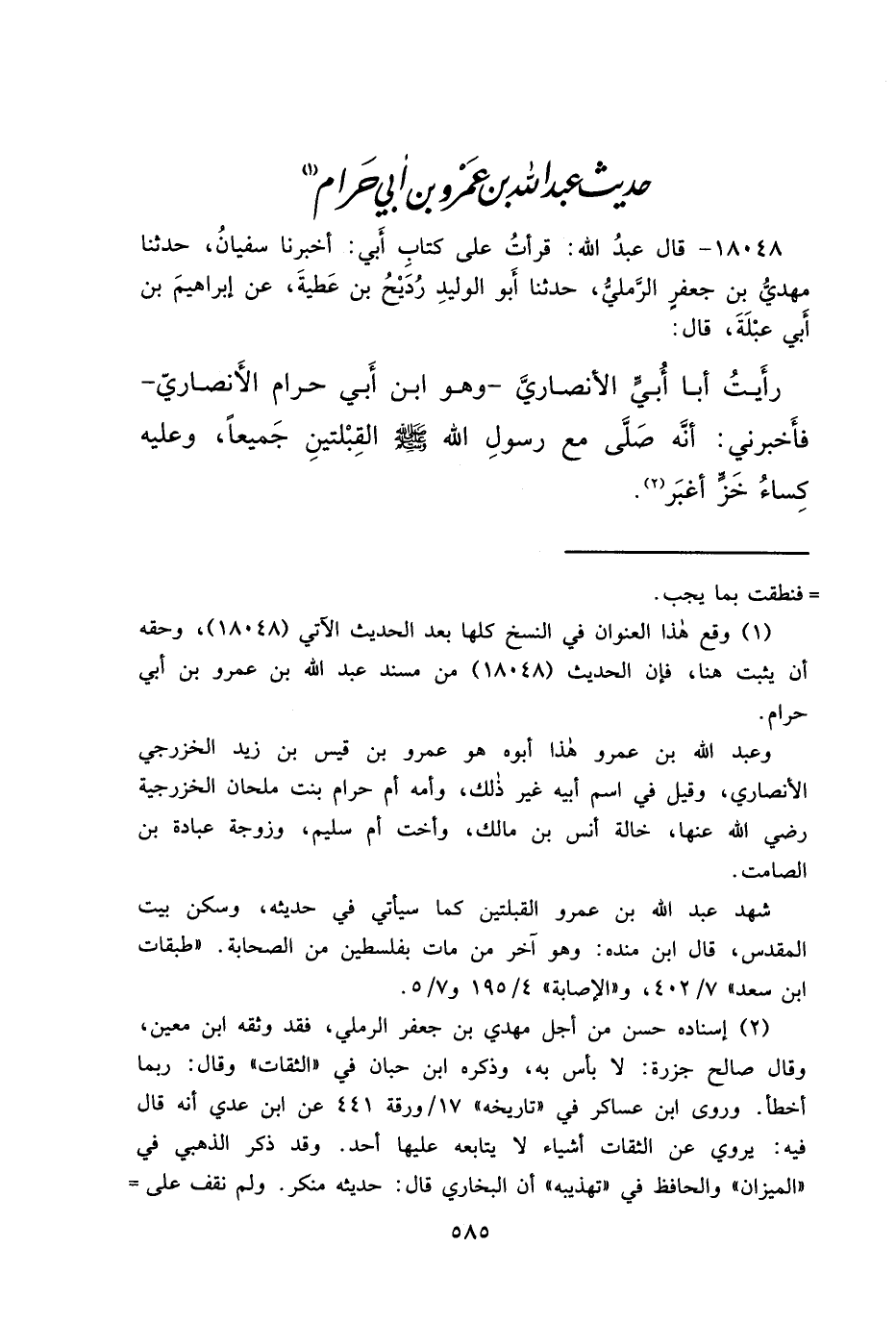 (١) وقع هذا العنوان في النسخ كلها بعد الحديث الآتي (١٨٠٤٨) ، وحقه أن يثبت هنا، فإن الحديث (١٨٠٤٨) من مسند عبد الله بن عمرو بن أبي حرام.