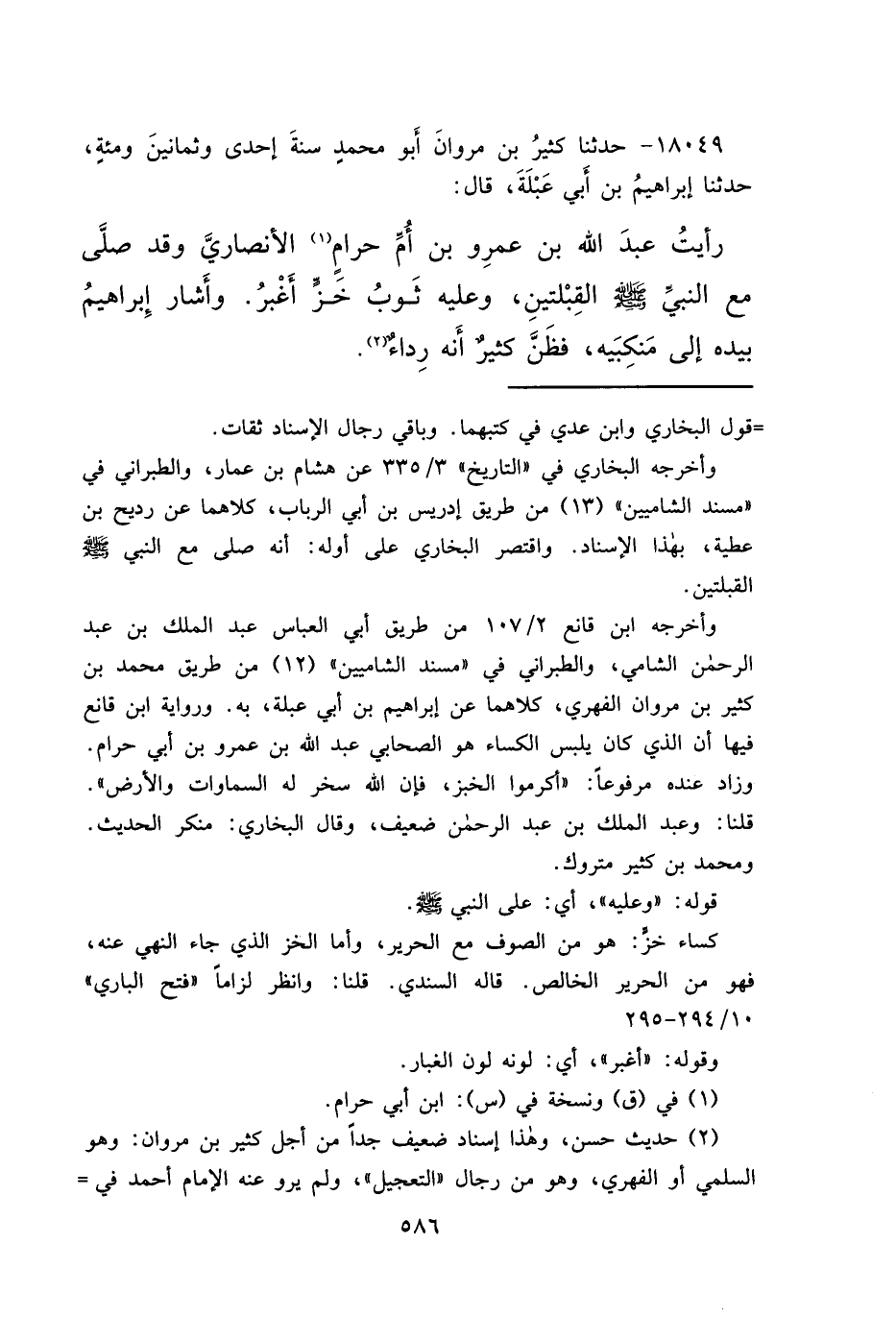 ١٨٠٤٩ - حَدَّثَنَا كَثِيرُ بْنُ مَرْوَانَ أَبُو مُحَمَّدٍ، سَنَةَ إِحْدَى وَثَمَانِينَ وَمِائَةٍ حَدَّثَنَا إِبْرَاهِيمُ بْنُ أَبِي عَبْلَةَ، قَالَ: رَأَيْتُ عَبْدَ اللهِ بْنَ عَمْرِو بْنِ أُمِّ حَرَامٍ (١) الْأَنْصَارِيَّ وَقَدْ " صَلَّى مَعَ النَّبِيِّ صَلَّى اللهُ عَلَيْهِ وَسَلَّمَ الْقِبْلَتَيْنِ، وَعَلَيْهِ ثَوْبُ خَزٍّ أَغْبَرُ " وَأَشَارَ إِبْرَاهِيمُ بِيَدِهِ إِلَى مَنْكِبَيْهِ، فَظَنَّ كَثِيرٌ أَنَّهُ رِدَاءٌ " (٢)