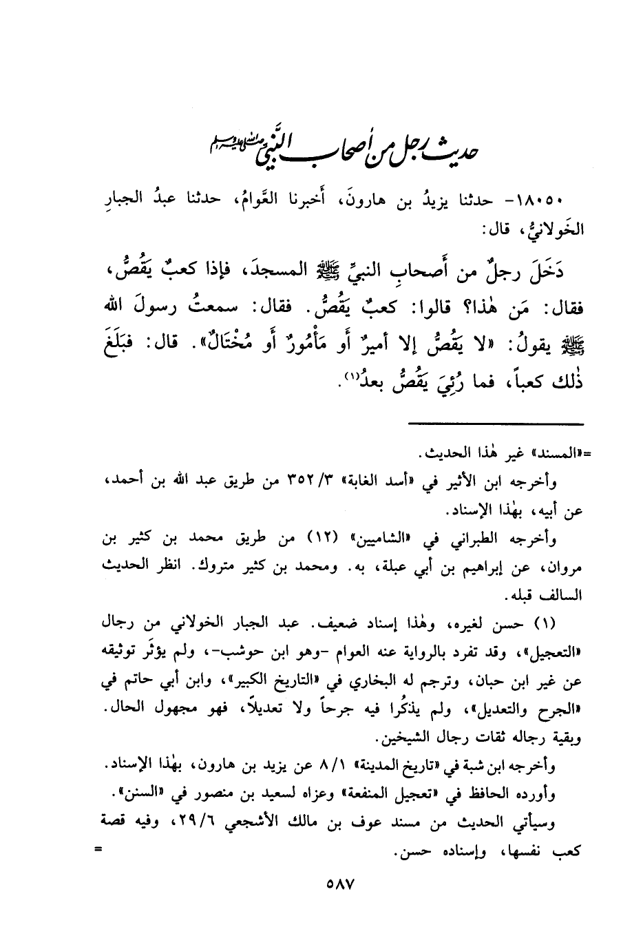١٨٠٥٠ - حَدَّثَنَا يَزِيدُ بْنُ هَارُونَ، أَخْبَرَنَا الْعَوَّامُ، حَدَّثَنَا عَبْدُ الْجَبَّارِ الْخَوْلَانِيُّ، قَالَ: دَخَلَ رَجُلٌ مِنْ أَصْحَابِ النَّبِيِّ صَلَّى اللهُ عَلَيْهِ وَسَلَّمَ الْمَسْجِدَ، فَإِذَا كَعْبٌ يَقُصُّ فَقَالَ: مَنْ هَذَا؟ قَالُوا: كَعْبٌ يَقُصُّ، فَقَالَ: سَمِعْتُ رَسُولَ اللهِ صَلَّى اللهُ عَلَيْهِ وَسَلَّمَ يَقُولُ: " لَا يَقُصُّ إِلَّا أَمِيرٌ، أَوْ مَأْمُورٌ، أَوْ مُخْتَالٌ " قَالَ: فَبَلَغَ ذَلِكَ كَعْبًا: " فَمَا رُئِيَ يَقُصُّ بَعْدُ " (١)