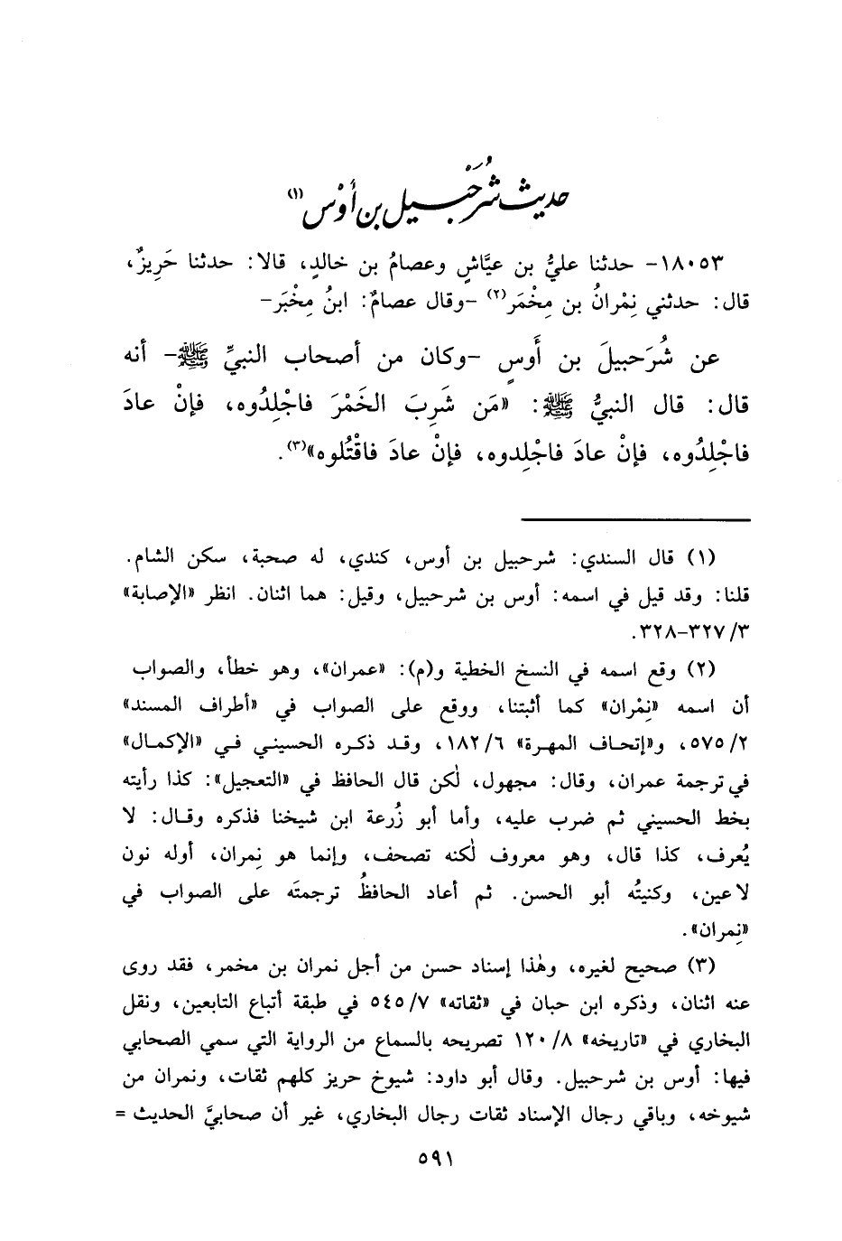 ١٨٠٥٣ - حَدَّثَنَا عَلِيُّ بْنُ عَيَّاشٍ، وَعِصَامُ بْنُ خَالِدٍ، قَالَا: حَدَّثَنَا حَرِيزٌ، قَالَ: حَدَّثَنِي نِمْرَانُ بْنُ مِخْمَرٍ (٢) ، وَقَالَ: عِصَامُ ابْنُ مُحْبِرٍ، عَنْ شُرَحْبِيلَ بْنِ أَوْسٍ، - وَكَانَ مِنْ أَصْحَابِ النَّبِيِّ صَلَّى اللهُ عَلَيْهِ وَسَلَّمَ - أَنَّهُ قَالَ: قَالَ النَّبِيُّ صَلَّى اللهُ عَلَيْهِ وَسَلَّمَ: " مَنْ شَرِبَ الْخَمْرَ فَاجْلِدُوهُ، فَإِنْ عَادَ فَاجْلِدُوهُ، فَإِنْ عَادَ فَاجْلِدُوهُ، فَإِنْ عَادَ فَاقْتُلُوهُ " (٣)