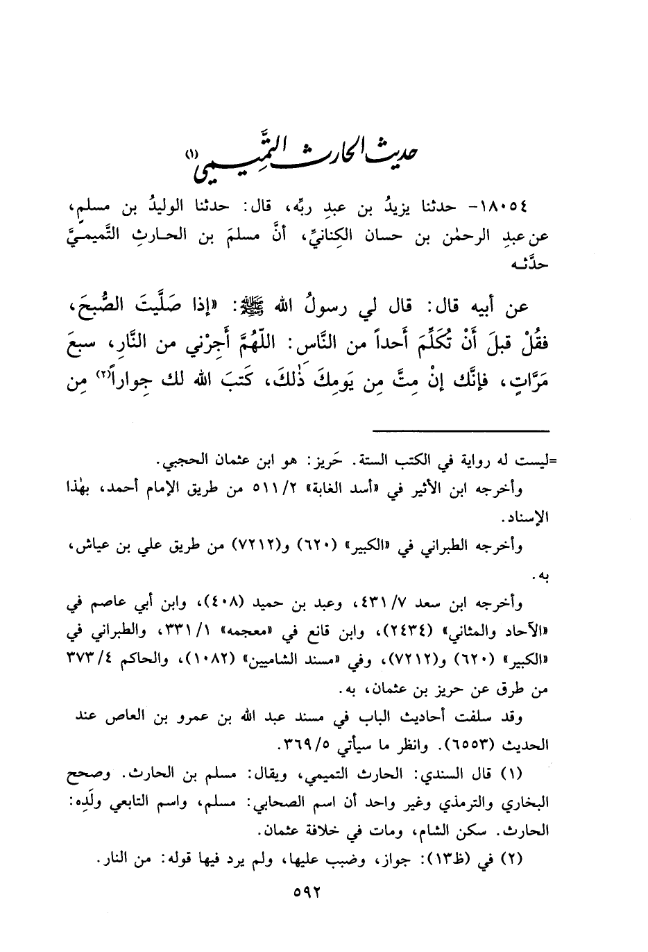 ١٨٠٥٤ - حَدَّثَنَا يَزِيدُ بْنُ عَبْدِ رَبِّهِ، قَالَ: حَدَّثَنَا الْوَلِيدُ بْنُ مُسْلِمٍ، عَنْ عَبْدِ الرَّحْمَنِ بْنِ حَسَّانَ الْكِنَانِيِّ، أَنَّ مُسْلِمُ بْنُ الْحَارِثِ التَّمِيمِيَّ، حَدَّثَهُ عَنْ أَبِيهِ، قَالَ: قَالَ لِي رَسُولُ اللهِ صَلَّى اللهُ عَلَيْهِ وَسَلَّمَ: " إِذَا صَلَّيْتَ الصُّبْحَ، فَقُلْ قَبْلَ أَنْ تُكَلِّمَ أَحَدًا مِنَ النَّاسِ: اللهُمَّ أَجِرْنِي مِنَ النَّارِ، سَبْعَ مَرَّاتٍ، فَإِنَّكَ إِنْ مِتَّ مِنْ يَوْمِكَ ذَلِكَ، كَتَبَ اللهُ لَكَ جِوَارًا (٢) مِنَ