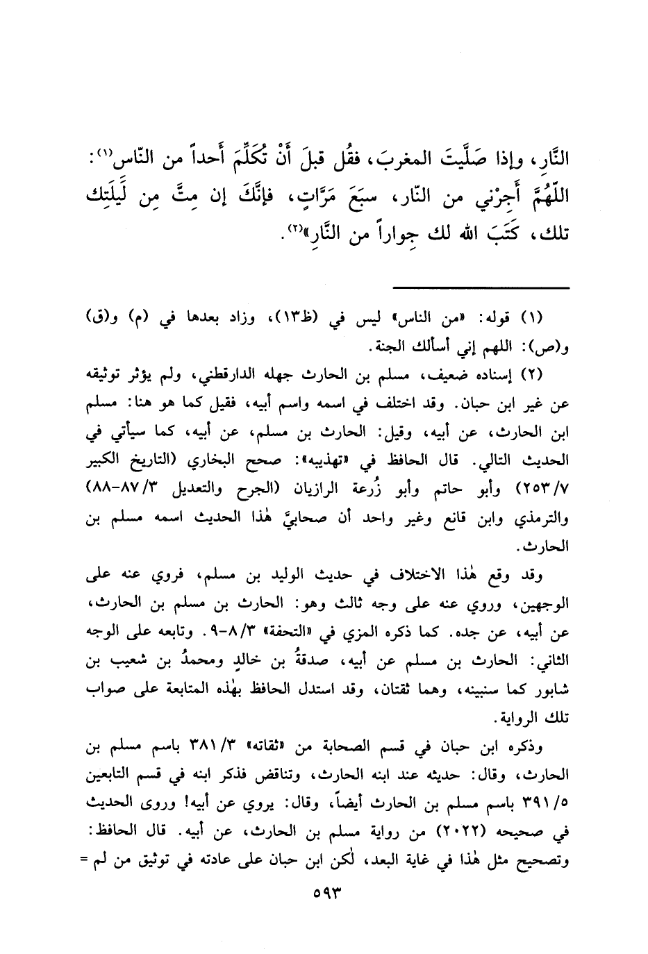 النَّارِ، وَإِذَا صَلَّيْتَ الْمَغْرِبَ، فَقُلْ قَبْلَ أَنْ تُكَلِّمَ أَحَدًا مِنَ النَّاسِ (١) : اللهُمَّ أَجِرْنِي مِنَ النَّارِ سَبْعَ مَرَّاتٍ، فَإِنَّكَ إِنْ مِتَّ مِنْ لَيْلَتِكَ تِلْكَ، كَتَبَ اللهُ لَكَ جِوَارًا مِنَ النَّارِ " (٢)