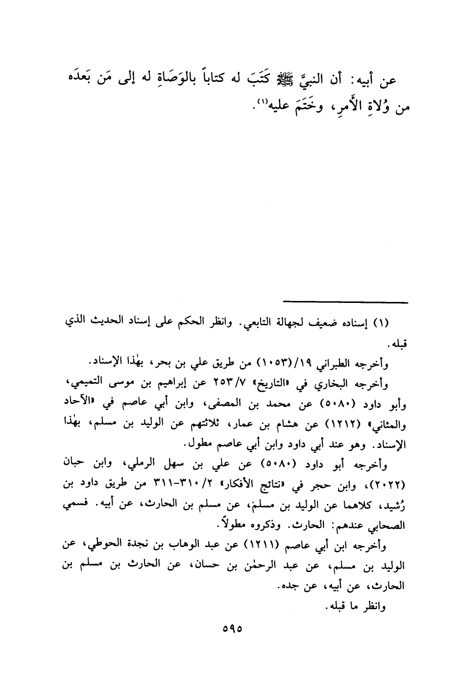 عَنْ أَبِيهِ، " " أَنَّ النَّبِيَّ صَلَّى اللهُ عَلَيْهِ وَسَلَّمَ كَتَبَ لَهُ كِتَابًا بِالْوَصَاةِ لَهُ إِلَى مَنْ بَعْدِهِ مِنْ وُلَاةِ الْأَمْرِ، وَخَتَمَ عَلَيْهِ " (١)