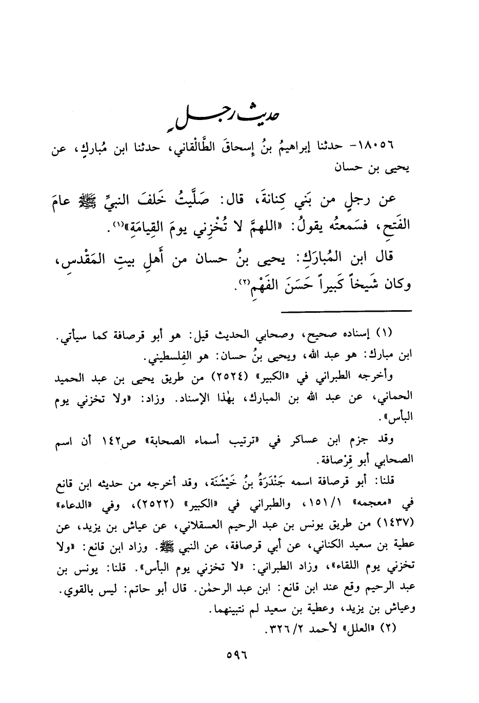 ١٨٠٥٦ - حَدَّثَنَا إِبْرَاهِيمُ بْنُ إِسْحَاقَ الطَّالَقَانِيُّ، حَدَّثَنَا ابْنُ مُبَارَكٍ، عَنْ يَحْيَى بْنِ حَسَّانَ، عَنْ رَجُلٍ، مِنْ بَنِي كِنَانَةَ قَالَ: صَلَّيْتُ خَلْفَ النَّبِيِّ صَلَّى اللهُ عَلَيْهِ وَسَلَّمَ عَامَ الْفَتْحِ فَسَمِعْتُهُ يَقُولُ: " اللهُمَّ لَا تُخْزِنِي يَوْمَ الْقِيَامَةِ " (١) قَالَ ابْنُ الْمُبَارَكِ: " يَحْيَى بْنُ حَسَّانَ مِنْ أَهْلِ بَيْتِ الْمَقْدِسِ وَكَانَ شَيْخًا كَبِيرًا حَسَنَ الْفَهْمِ " (٢)