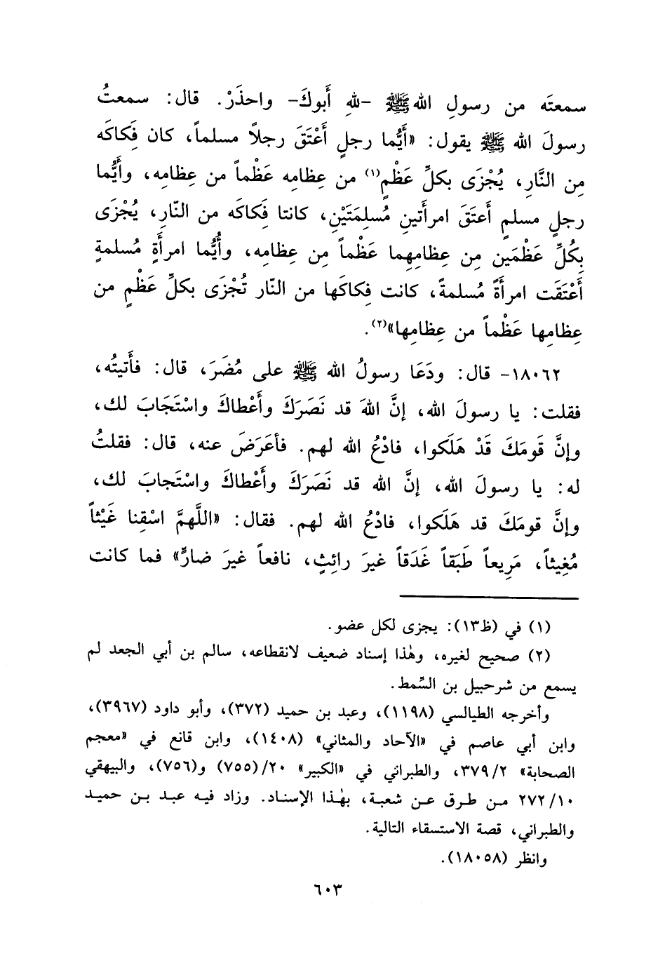 سَمِعْتَهُ مِنْ رَسُولِ اللهِ صَلَّى اللهُ عَلَيْهِ وَسَلَّمَ - لِلَّهِ أَبُوكَ - وَاحْذَرْ، قَالَ: سَمِعْتُ رَسُولَ اللهِ صَلَّى اللهُ عَلَيْهِ وَسَلَّمَ يَقُولُ: " أَيُّمَا رَجُلٍ أَعْتَقَ رَجُلًا مُسْلِمًا، كَانَ فِكَاكَهُ مِنَ النَّارِ، يُجْزَى بِكُلِّ عَظْمٍ (١) مِنْ عِظَامِهِ عَظْمًا مِنْ عِظَامِهِ، وَأَيُّمَا رَجُلٍ مُسْلِمٍ أَعْتَقَ امْرَأَتَيْنِ مُسْلِمَتَيْنِ، كَانَتَا فِكَاكَهُ مِنَ النَّارِ يُجْزَى بِكُلِّ عَظْمَيْنِ مِنْ عِظَامِهِمَا عَظْمًا مِنْ عِظَامِهِ، وَأَيُّمَا امْرَأَةٍ مُسْلِمَةٍ أَعْتَقَتْ امْرَأَةً مُسْلِمَةً كَانَتْ فِكَاكَهَا مِنَ النَّارِ تُجْزَى بِكُلِّ عَظْمٍ مِنْ عِظَامِهَا عَظْمًا مِنْ عِظَامِهَا " (٢)