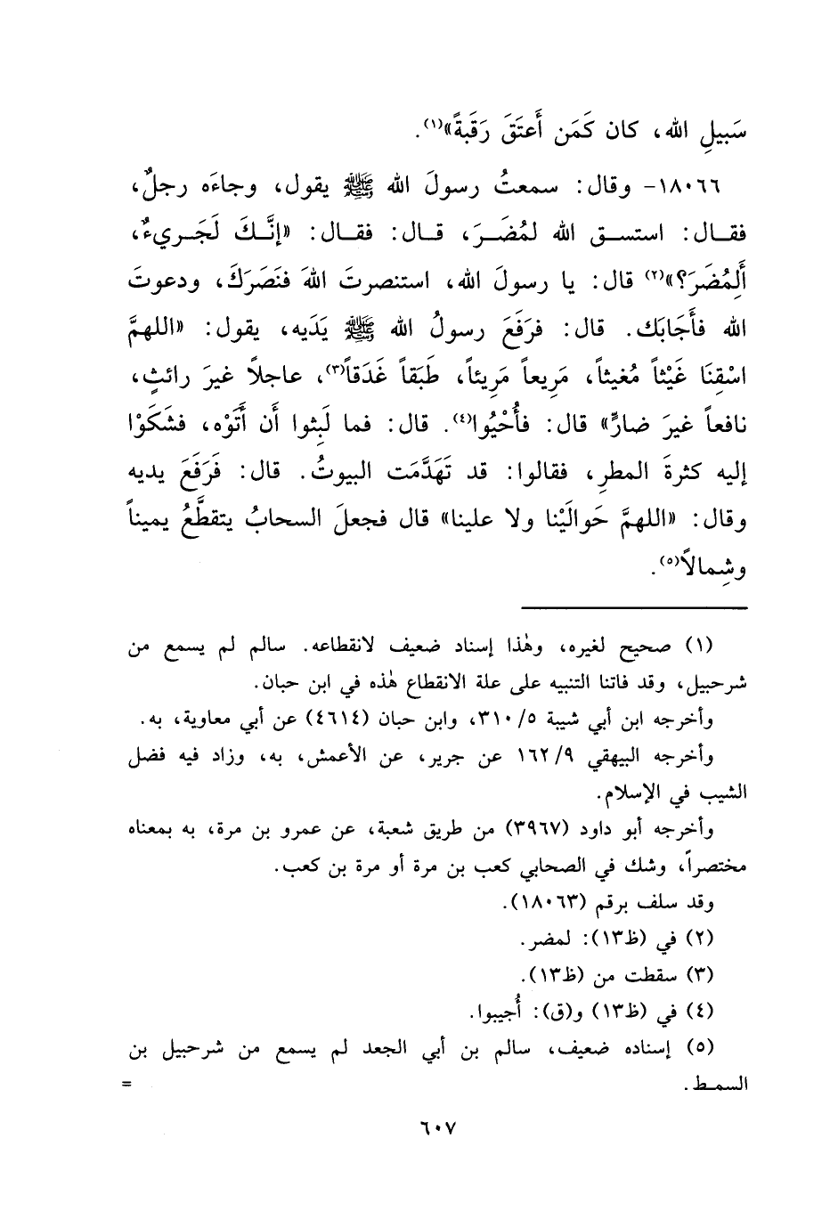 ١٨٠٦٦ - وَقَالَ: سَمِعْتُ رَسُولَ اللهِ صَلَّى اللهُ عَلَيْهِ وَسَلَّمَ يَقُولُ، وَجَاءَهُ رَجُلٌ، فَقَالَ: اسْتَسْقِ اللهَ لِمُضَرَ، قَالَ: فَقَالَ: " إِنَّكَ لَجَرِيءٌ، أَلِمُضَرَ؟ (٢) "، قَالَ: يَا رَسُولَ اللهِ، اسْتَنْصَرْتَ اللهَ فَنَصَرَكَ، وَدَعَوْتَ اللهَ، فَأَجَابَكَ، قَالَ: فَرَفَعَ رَسُولُ اللهِ صَلَّى اللهُ عَلَيْهِ وَسَلَّمَ يَدَيْهِ، يَقُولُ: " اللهُمَّ اسْقِنَا غَيْثًا مُغِيثًا، مَرِيعًا، مَرِيئًا، طَبَقًا غَدَقًا (٣) ، عَاجِلًا، غَيْرَ رَائِثٍ، نَافِعًا غَيْرَ ضَارٍّ " قَالَ: فَأُحْيُوا (٤) ، قَالَ: فَمَا لَبِثُوا أَنْ أَتَوْهُ، فَشَكَوْا إِلَيْهِ كَثْرَةَ الْمَطَرِ، فَقَالُوا: قَدْ تَهَدَّمَتِ الْبُيُوتُ، قَالَ: فَرَفَعَ يَدَيْهِ، وَقَالَ: " اللهُمَّ حَوَالَيْنَا، وَلَا عَلَيْنَا " قَالَ: فَجَعَلَ السَّحَابُ يَتَقَطَّعُ يَمِينًا وَشِمَالًا (٥)