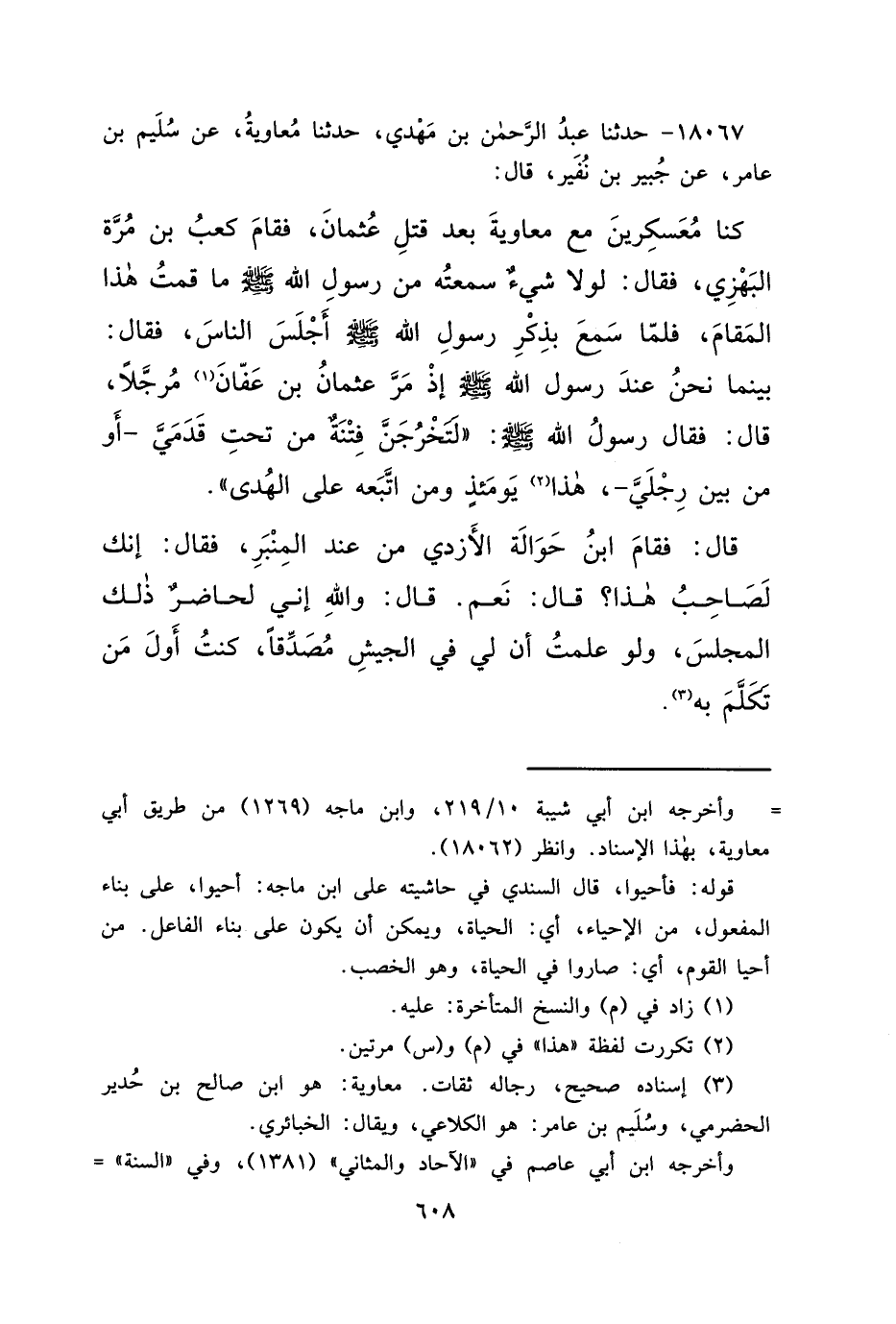 ١٨٠٦٧ - حَدَّثَنَا عَبْدُ الرَّحْمَنِ بْنُ مَهْدِيٍّ، حَدَّثَنَا مُعَاوِيَةُ، عَنْ سُلَيْمِ بْنِ عَامِرٍ، عَنْ جُبَيْرِ بْنِ نُفَيْرٍ، قَالَ: كُنَّا مُعَسْكِرِينَ مَعَ مُعَاوِيَةَ بَعْدَ قَتْلِ عُثْمَانَ، فَقَامَ كَعْبُ بْنُ مُرَّةَ الْبَهْزِيُّ فَقَالَ: لَوْلَا شَيْءٌ سَمِعْتُهُ مِنْ رَسُولِ اللهِ صَلَّى اللهُ عَلَيْهِ وَسَلَّمَ مَا قُمْتُ هَذَا الْمَقَامَ، فَلَمَّا سَمِعَ بِذِكْرِ رَسُولِ اللهِ صَلَّى اللهُ عَلَيْهِ وَسَلَّمَ، أَجْلَسَ النَّاسَ، فَقَالَ: بَيْنَمَا نَحْنُ عِنْدَ رَسُولِ اللهِ صَلَّى اللهُ عَلَيْهِ وَسَلَّمَ، إِذْ مَرَّ عُثْمَانُ بْنُ عَفَّانَ (١) مُرَجِّلًا قَالَ:، فَقَالَ رَسُولُ اللهِ صَلَّى اللهُ عَلَيْهِ وَسَلَّمَ: " لَتَخْرُجَنَّ فِتْنَةٌ مِنْ تَحْتِ قَدَمَيْ، أَوْ مِنْ بَيْنِ رِجْلَيْ، هَذَا (٢) ، يَوْمَئِذٍ وَمَنِ اتَّبَعَهُ عَلَى الْهُدَى " قَالَ: فَقَامَ ابْنُ حَوَالَةَ الْأَزْدِيُّ مِنْ عِنْدِ الْمِنْبَرِ، فَقَالَ: إِنَّكَ لَصَاحِبُ هَذَا؟ قَالَ: نَعَمْ، قَالَ: وَاللهِ إِنِّي لَحَاضِرٌ ذَلِكَ الْمَجْلِسَ، وَلَوْ عَلِمْتُ أَنَّ لِي فِي الْجَيْشِ مُصَدِّقًا كُنْتُ أَوَّلَ مَنْ تَكَلَّمَ بِهِ (٣)
