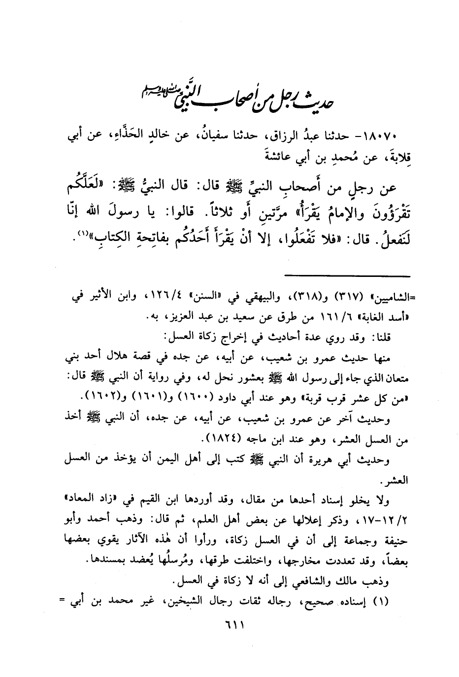 ١٨٠٧٠ - حَدَّثَنَا عَبْدُ الرَّزَّاقِ، حَدَّثَنَا سُفْيَانُ، عَنْ خَالِدٍ الْحَذَّاءِ، عَنْ أَبِي قِلَابَةَ، عَنْ مُحَمَّدِ بْنِ أَبِي عَائِشَةَ، عَنْ رَجُلٍ مِنْ أَصْحَابِ النَّبِيِّ صَلَّى اللهُ عَلَيْهِ وَسَلَّمَ قَالَ: قَالَ النَّبِيُّ صَلَّى اللهُ عَلَيْهِ وَسَلَّمَ: " لَعَلَّكُمْ تَقْرَءُونَ وَالْإِمَامُ يَقْرَأُ " مَرَّتَيْنِ، أَوْ ثَلَاثًا، قَالُوا: يَا رَسُولَ اللهِ، إِنَّا لَنَفْعَلُ. قَالَ: " فَلَا تَفْعَلُوا، إِلَّا أَنْ يَقْرَأَ أَحَدُكُمْ بِفَاتِحَةِ الْكِتَابِ " (١)
