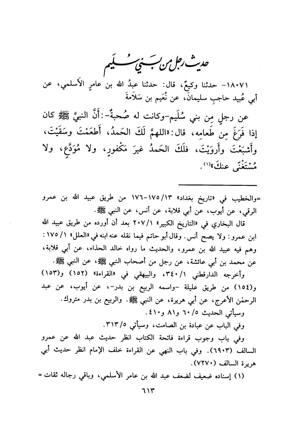 ١٨٠٧١ - حَدَّثَنَا وَكِيعٌ، قَالَ: حَدَّثَنَا عَبْدُ اللهِ بْنُ عَامِرٍ الْأَسْلَمِيُّ، عَنْ أَبِي عُبَيْدٍ، حَاجِبِ سُلَيْمَانَ، عَنْ نُعَيْمِ بْنِ سَلَامَةَ، عَنْ رَجُلٍ مِنْ بَنِي سُلَيْمٍ، وَكَانَتْ لَهُ صُحْبَةٌ،: أَنَّ النَّبِيَّ صَلَّى اللهُ عَلَيْهِ وَسَلَّمَ، كَانَ إِذَا فَرَغَ مِنْ طَعَامِهِ، قَالَ: " اللهُمَّ لَكَ الْحَمْدُ، أَطْعَمْتَ وَسَقَيْتَ، وَأَشْبَعْتَ وَأَرْوَيْتَ، فَلَكَ الْحَمْدُ غَيْرَ مَكْفُورٍ، وَلَا مُوَدَّعٍ، وَلَا مُسْتَغْنًى عَنْكَ " (١)
