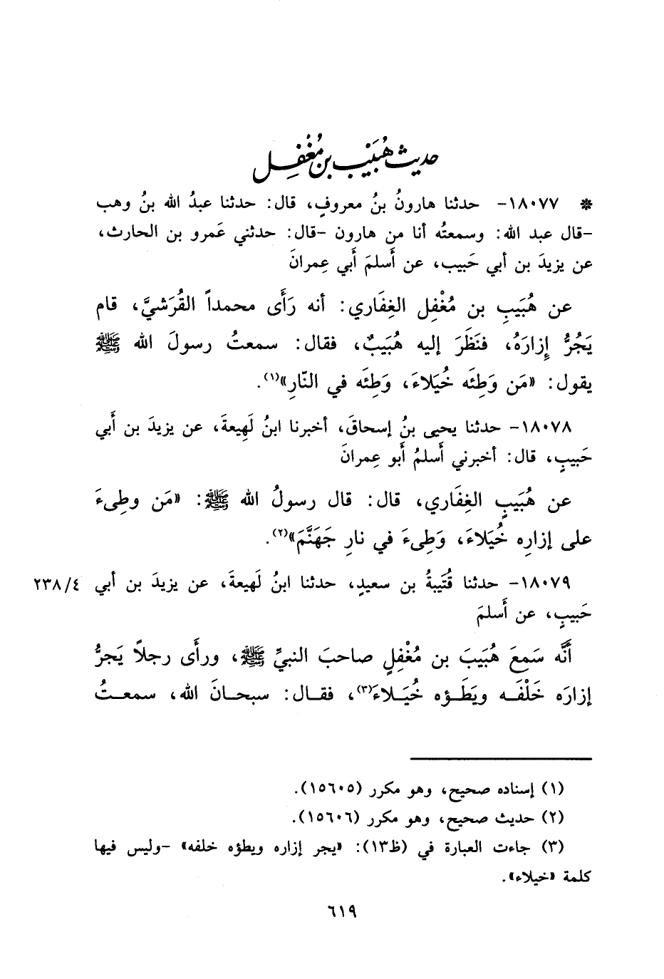 * ١٨٠٧٧ - حَدَّثَنَا هَارُونُ بْنُ مَعْرُوفٍ، قَالَ: حَدَّثَنَا عَبْدُ اللهِ بْنُ وَهْبٍ، قَالَ عَبْدُ اللهِ: وَسَمِعْتُهُ أَنَا مِنْ هَارُونَ، قَالَ: حَدَّثَنِي عَمْرُو بْنُ الْحَارِثِ، عَنْ يَزِيدَ بْنِ أَبِي حَبِيبٍ، عَنْ أَسْلَمَ أَبِي عِمْرَانَ، عَنْ هُبَيْبِ بْنِ مُغْفِلٍ الْغِفَارِيِّ، أَنَّهُ رَأَى مُحَمَّدًا الْقُرَشِيَّ، قَامَ يَجُرُّ إِزَارَهُ، فَنَظَرَ إِلَيْهِ هُبَيْبٌ، فَقَالَ: سَمِعْتُ رَسُولَ اللهِ صَلَّى اللهُ عَلَيْهِ وَسَلَّمَ يَقُولُ: " مَنْ وَطِئَهُ خُيَلَاءَ، وَطِئَهُ فِي النَّارِ " (١)