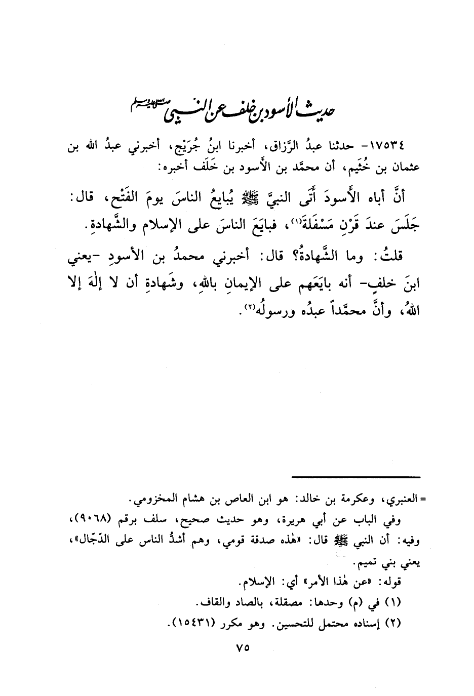 ١٧٥٣٤ - حَدَّثَنَا عَبْدُ الرَّزَّاقِ، أَخْبَرَنَا ابْنُ جُرَيْجٍ، أَخْبَرَنِي عَبْدُ اللهِ بْنُ عُثْمَانَ بْنِ خُثَيْمٍ، أَنَّ مُحَمَّدَ بْنَ الْأَسْوَدِ بْنِ خَلَفٍ، أَخْبَرَهُ أَنَّ أَبَاهُ الْأَسْوَدَ، أَتَى النَّبِيَّ صَلَّى اللهُ عَلَيْهِ وَسَلَّمَ يُبَايِعُ النَّاسَ يَوْمَ الْفَتْحِ، قَالَ: " جَلَسَ عِنْدَ قَرْنِ مَسْفَلَةَ (١) ، فَبَايَعَ النَّاسَ عَلَى الْإِسْلَامِ وَالشَّهَادَةِ " قُلْتُ: وَمَا الشَّهَادَةُ؟ قَالَ: أَخْبَرَنِي مُحَمَّدُ بْنُ الْأَسْوَدِ يَعْنِي ابْنَ خَلَفٍ " أَنَّهُ بَايَعَهُمْ عَلَى الْإِيمَانِ بِاللهِ، وَشَهَادَةِ أَنْ لَا إِلَهَ إِلَّا اللهُ، وَأَنَّ مُحَمَّدًا عَبْدُهُ وَرَسُولُهُ " (٢)