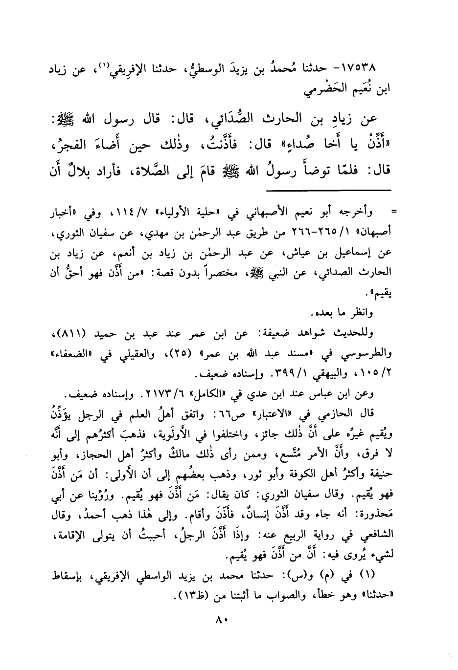 ١٧٥٣٨ - حَدَّثَنَا مُحَمَّدُ بْنُ يَزِيدَ الْوَاسِطِيُّ، حَدَّثَنَا الْإِفْرِيقِيِّ (١) ، عَنْ زِيَادِ بْنِ نُعَيْمٍ الْحَضْرَمِيِّ، عَنْ زِيَادِ بْنِ الْحَارِثِ الصُّدَائِيِّ، قَالَ: قَالَ رَسُولُ اللهِ صَلَّى اللهُ عَلَيْهِ وَسَلَّمَ: " أَذِّنْ يَا أَخَا صُدَاءٍ " قَالَ: فَأَذَّنْتُ، وَذَلِكَ حِينَ أَضَاءَ الْفَجْرُ، قَالَ: فَلَمَّا تَوَضَّأَ رَسُولُ اللهِ صَلَّى اللهُ عَلَيْهِ وَسَلَّمَ قَامَ إِلَى الصَّلَاةِ، فَأَرَادَ بِلَالٌ أَنْ