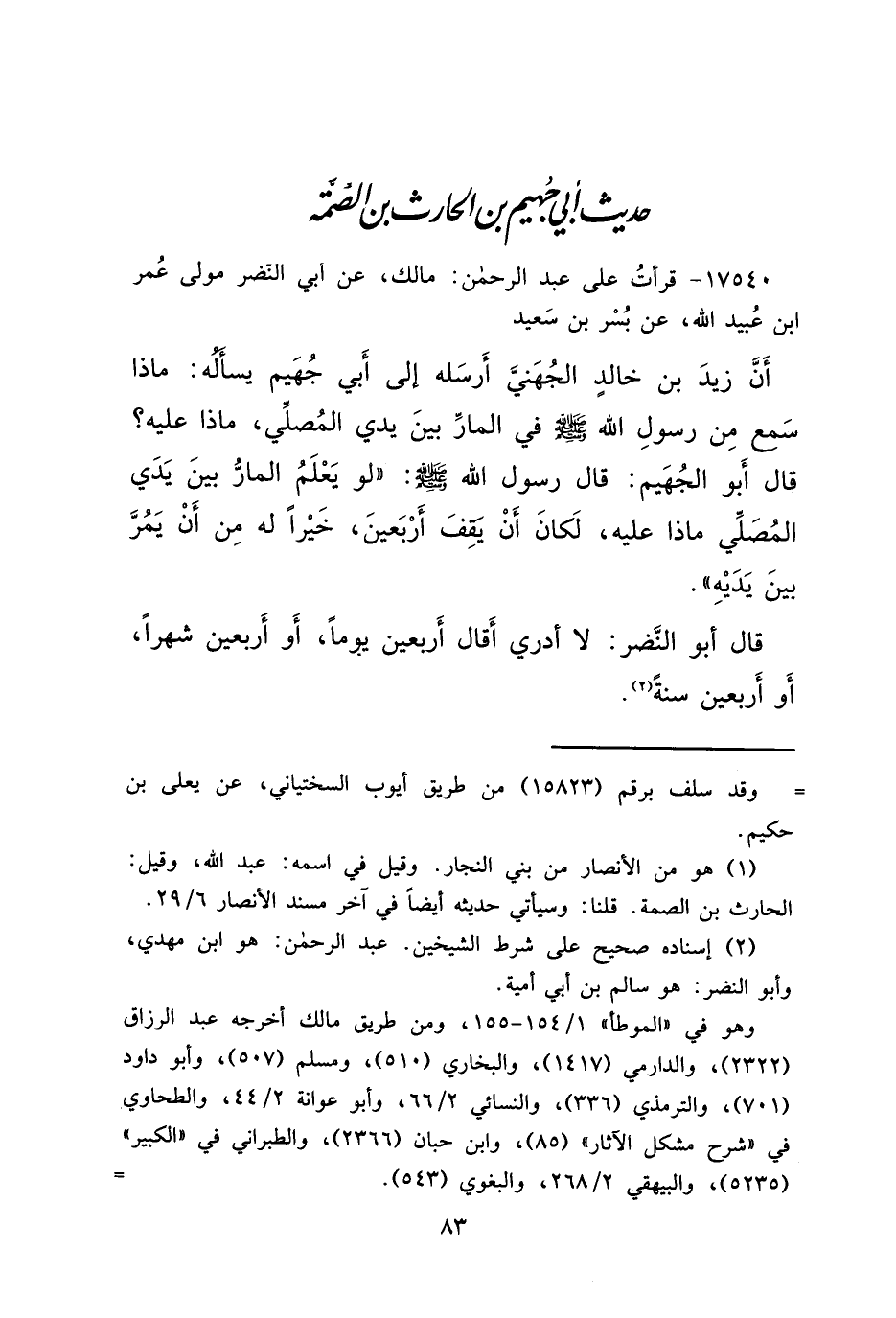 ١٧٥٤٠ - قَرَأْتُ عَلَى عَبْدِ الرَّحْمَنِ: مَالِكٌ، عَنْ أَبِي النَّضْرِ، مَوْلَى عُمَرَ بْنِ عُبَيْدِ اللهِ، عَنْ بُسْرِ بْنِ سَعِيدٍ، أَنَّ زَيْدَ بْنَ خَالِدٍ الْجُهَنِيَّ أَرْسَلَهُ إِلَى أَبِي جُهَيْمٍ يَسْأَلُهُ: مَاذَا سَمِعَ مِنْ رَسُولِ اللهِ صَلَّى اللهُ عَلَيْهِ وَسَلَّمَ فِي الْمَارِّ بَيْنَ يَدَيِ الْمُصَلِّي، مَاذَا عَلَيْهِ؟ قَالَ أَبُو الْجُهَيْمِ: قَالَ رَسُولُ اللهِ صَلَّى اللهُ عَلَيْهِ وَسَلَّمَ: " لَوْ يَعْلَمُ الْمَارُّ بَيْنَ يَدَيِ الْمُصَلِّي مَاذَا عَلَيْهِ، لَكَانَ أَنْ يَقِفَ أَرْبَعِينَ، خَيْرًا لَهُ مِنْ أَنْ يَمُرَّ بَيْنَ يَدَيْهِ " قَالَ أَبُو النَّضْرِ: " لَا أَدْرِي أَقَالَ أَرْبَعِينَ يَوْمًا، أَوْ أَرْبَعِينَ شَهْرًا، أَوْ أَرْبَعِينَ سَنَةً " (٢)