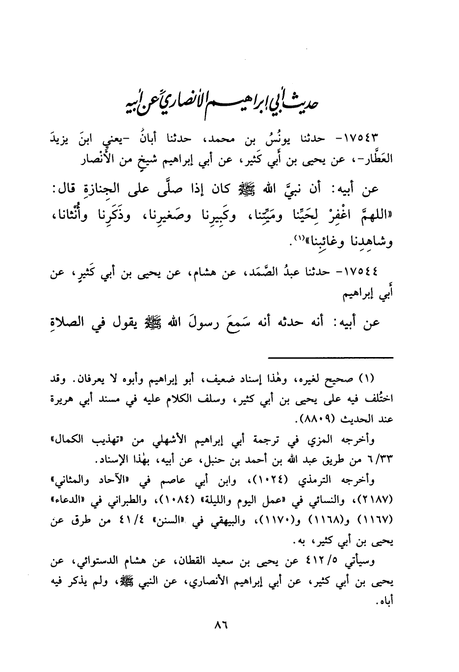 ١٧٥٤٣ - حَدَّثَنَا يُونُسُ بْنُ مُحَمَّدٍ، حَدَّثَنَا أَبَانُ يَعْنِي ابْنَ يَزِيدَ الْعَطَّارَ، عَنْ يَحْيَى بْنِ أَبِي كَثِيرٍ، عَنْ أَبِي إِبْرَاهِيمَ، شَيْخٍ مِنَ الْأَنْصَارِ، عَنْ أَبِيه: أَنَّ نَبِيَّ اللهِ صَلَّى اللهُ عَلَيْهِ وَسَلَّمَ كَانَ إِذَا صَلَّى عَلَى الْجِنَازَةِ قَالَ: " اللهُمَّ اغْفِرْ لِحَيِّنَا وَمَيِّتِنَا، وَكَبِيرِنَا وَصَغِيرِنَا، وَذَكَرِنَا وَأُنْثَانَا، وَشَاهِدِنَا وَغَائِبِنَا " (١)